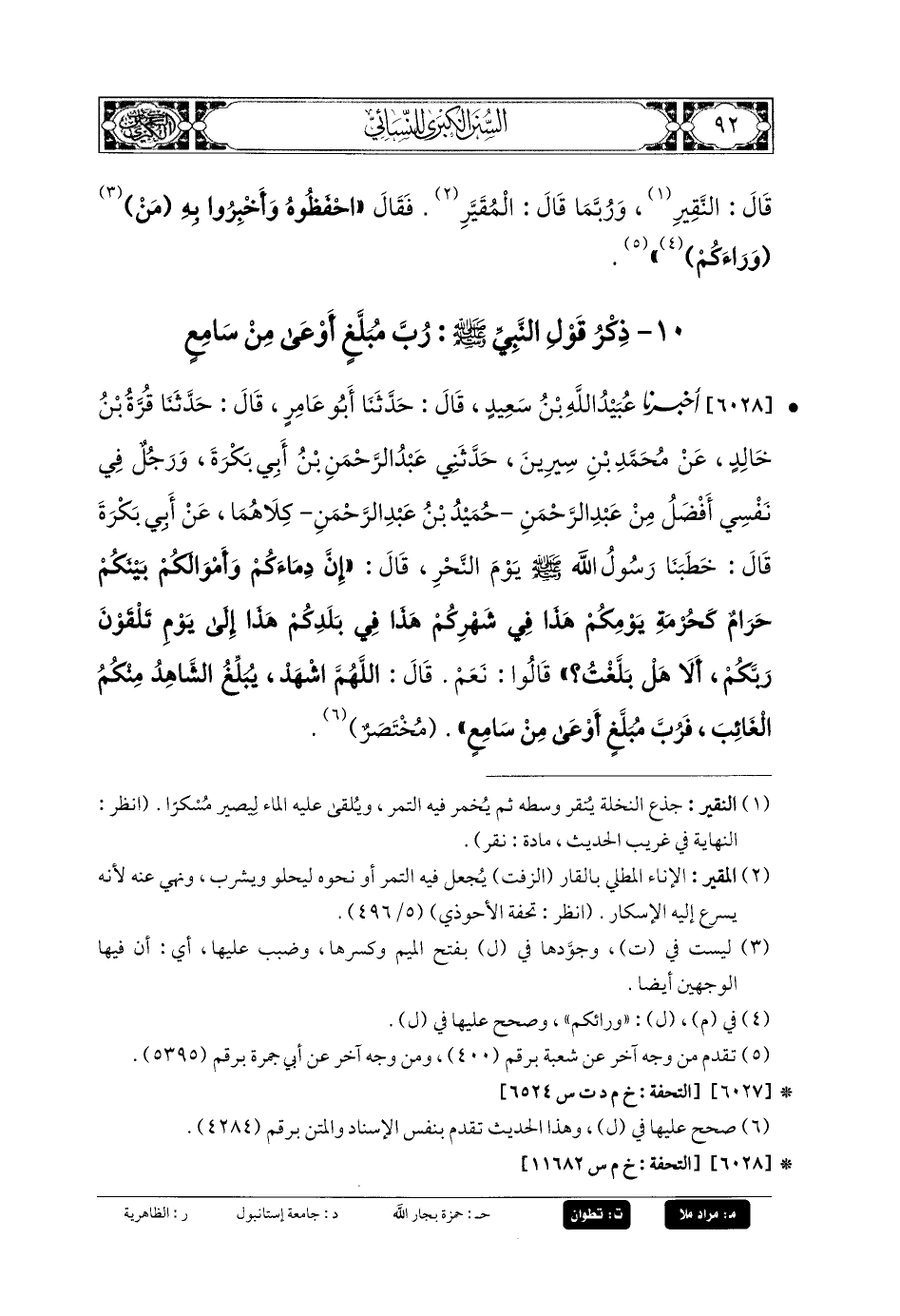 6028- أَخبَرنا عُبَيدُ اللهِ بنُ سَعِيدٍ، قَالَ: حَدثنا أَبو عَامِرٍ، قَالَ: حَدثنا قُرَّةُ بنُ خَالِدٍ، عَن مُحَمدِ بنِ سِيرِينَ، قَالَ: حَدَّثني عَبدُ الرَّحمَنِ بنُ أَبي بَكْرَةَ، وَرَجُلٌ فِي نَفْسِي أَفْضَلُ مِنْ عَبدِ الرَّحمَنِ حُمَيْدُ بنُ عَبدِ الرَّحمَنِ كِلاهُمَا عَن أَبي بَكْرَةَ، فَقَالَ: خَطَبَنَا رَسُولُ اللهِ صَلى الله عَليه وسَلم يَوْمَ النَّحْرِ فَقَالَ: إِنَّ دِمَاءَكُمْ وَأَمْوَالَكُمْ بَيْنَكُمْ حَرَامٌ، كَحُرْمَةِ يَوْمِكُمْ هَذَا، فِي شَهْرِكُمْ هَذَا، فِي بَلَدِكُمْ هَذَا، إِلَى يَوْمِ تَلْقَوْنَ رَبَّكُمْ أَلا هَلْ بَلَّغْتُ؟ قَالُوا: نَعَمْ، قَالَ: اللهُمَّ اشْهَدْ، يُبَلِّغُ الشَّاهِدُ مِنْكُمُ الغَائِبَ، فَرُبَّ مُبَلَّغٍ أَوْعَى مِنْ سَامِعٍ ... مُخْتَصَرٌ.