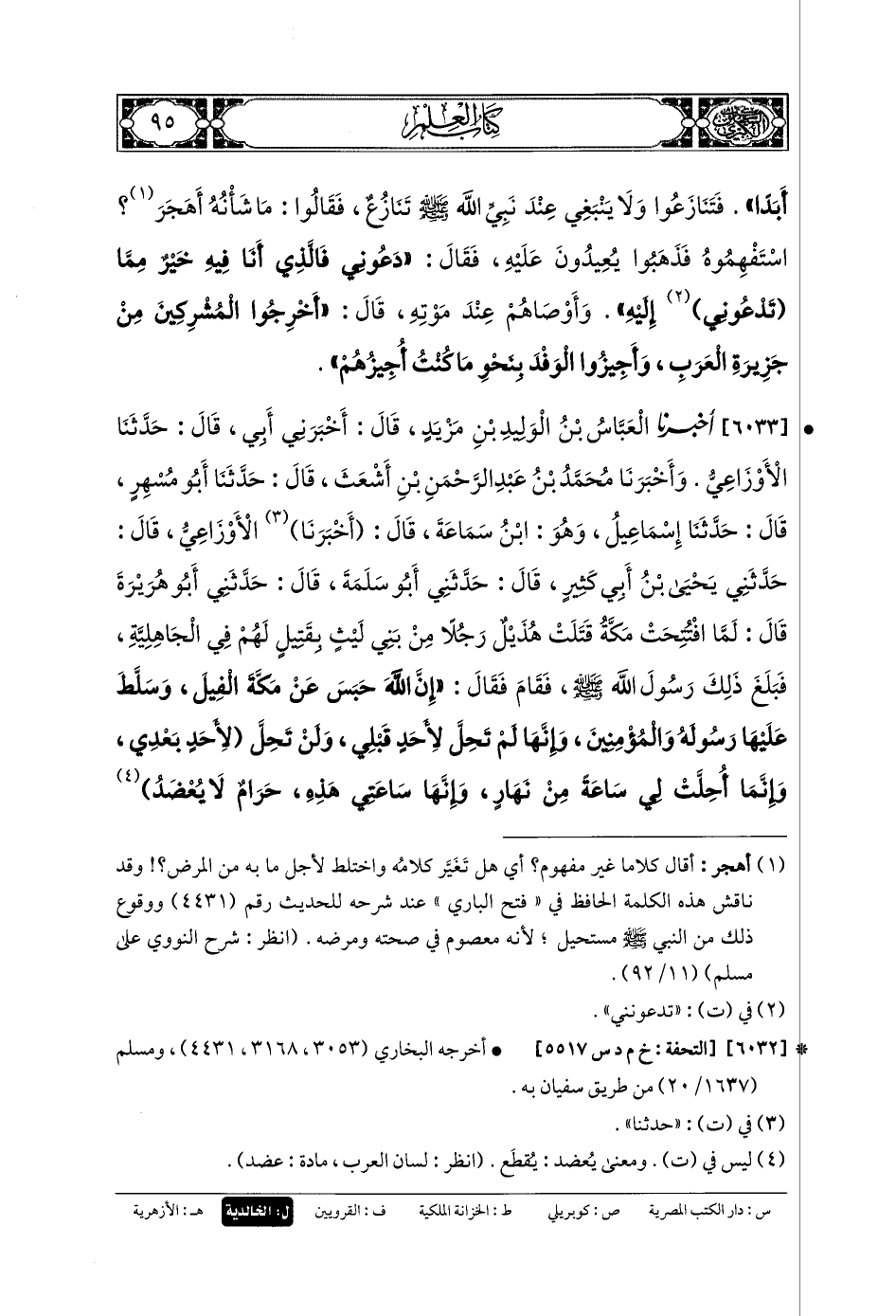 6033- أَخبَرنا العَبَّاسُ بنُ الوَلِيدِ بنِ مَزْيَدٍ، قَالَ: أَخبَرني أَبي، قَالَ: حَدثنا الأَوْزَاعِيُّ وَأَخبَرنا مُحَمدُ بنُ عَبدِ الرَّحمَنِ بنِ أَشْعَثَ، قَالَ: حَدثنا أَبو مُسْهِرٍ، قَالَ: حَدثنا إِسمَاعِيلُ، وَهُوَ ابنُ سَمَاعَةَ، قَالَ: أَخبَرنا الأَوْزَاعِيُّ، قَالَ: حَدَّثني يَحيَى بنُ أَبي كَثِيرٍ، قَالَ: حَدَّثني أَبو سَلَمَةَ، قَالَ: حَدَّثني أَبو هُرَيرَةَ، قَالَ: لَمَّا افْتُتِحَتْ مَكَّةُ، قَتَلَتْ هُذَيْلٌ رَجُلاً مِنْ بَنِي لَيْثٍ بِقَتِيلٍ لَهُمْ فِي الجَاهِلِيَّةِ، فَبَلَغَ ذَلِكَ رَسُولَ اللهِ صَلى الله عَليه وسَلم، فَقَامَ فَقَالَ: إِنَّ اللهَ حَبَسَ عَن مَكَّةَ الفِيلَ، وَسَلَّطَ عَلَيْهَا رَسُولَهُ وَالمُؤْمِنِينَ، وَإِنَّهَا لَمْ تَحِلَّ لأَحَدٍ قَبْلِي، وَلَنْ تَحِلَّ لأَحَدٍ بَعْدِي، وَإِنَّمَا أُحِلَّتْ لِيَ سَاعَةً مِنْ نَهَارٍ، وَإِنَّهَا سَاعَتِي هَذِهِ، حَرَامٌ لا يُعْضَدُ شَجَرُهَا، وَلا يُخْتَلَى شَوْكُهَا، وَلا يُلْتَقَطُ سَاقِطَتَهَا إِلاَّ مُنْشِدٌ، وَمَنْ قُتِلَ لَهُ قَتِيلٌ فَهُوَ بِخَيْرِ النَّظَرَيْنِ، إِمَّا يُقَادُ وَإِمَّا يُفْدَى، فَقَامَ رَجُلٌ مِنْ أَهْلِ اليَمَنِ يُقَالَ لَهُ: أَبو شَاه، فَقَالَ: يَا رَسُولَ اللهِ، اكْتُبُوا لِي، فَقَالَ رَسُولُ اللهِ صَلى الله عَليه وسَلم: اكْتُبُوا لأَبي شَاه، ثُمَّ قَامَ العَبَّاسُ، فَقَالَ: يَا رَسُولَ اللهِ، إِلاَّ الإِذْخِرَ، فَإِنَّا نَجْعَلُهُ فِي مَسَاكِنِنَا وَقُبُورِنَا، فَقَالَ رَسُولُ اللهِ صَلى الله عَليه وسَلم: إِلاَّ الإِذْخِرَ.
