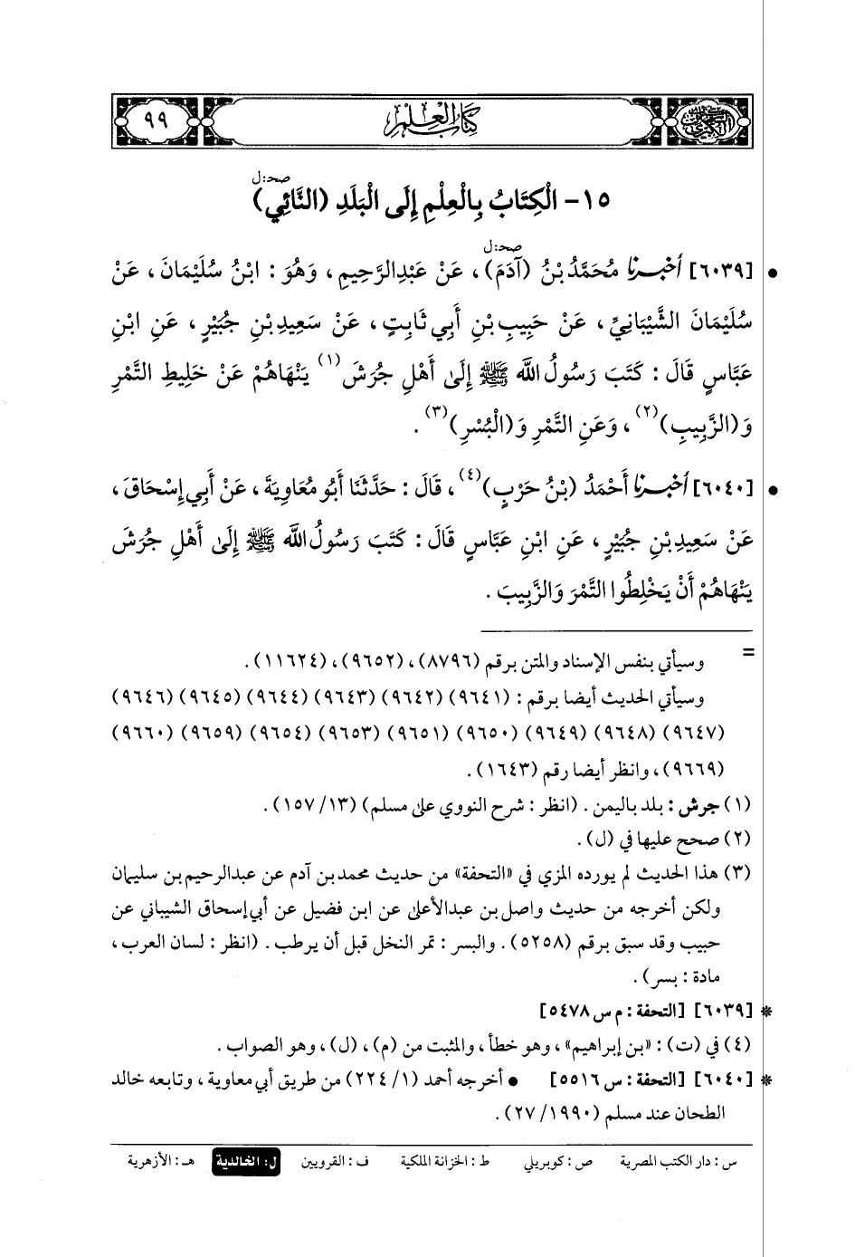 6039 - أَخبَرنا مُحَمدُ بنُ آدَمَ، عَن عَبدِ الرَّحِيمِ، وَهُوَ ابنُ سُلَيمَانَ، عَن سُلَيمَانَ الشَّيْبَانِيِّ، عَن حَبِيبِ بنِ أَبي ثَابِتٍ، عَن سَعِيدِ بنِ جُبَيْرٍ، عَنِ ابنِ عَبَّاسٍ، قَالَ: كَتَبَ رَسُولُ اللهِ صَلى الله عَليه وسَلم إِلَى أَهْلِ جَرَشَ، يَنْهَاهُمْ عَن خَلِيطِ التَّمْرِ وَالزَّبِيبِ، وَعَنِ التَّمْرِ وَالبُسْرِ.