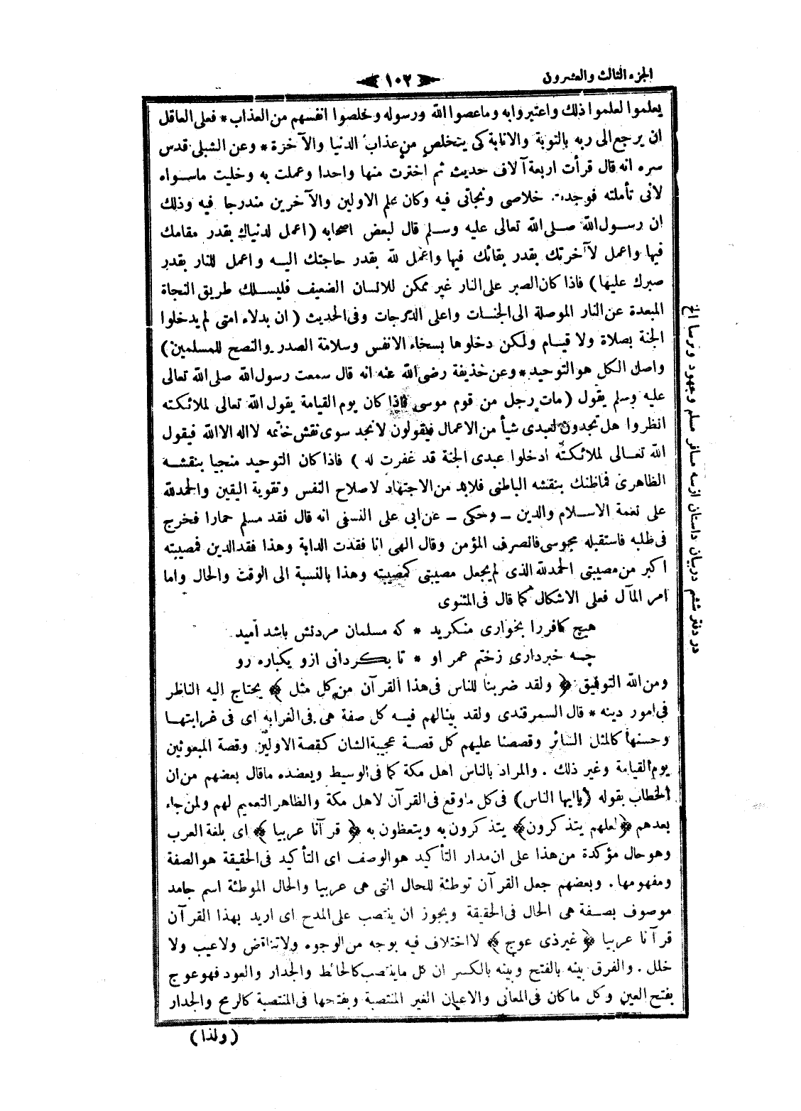 يعلموا لعلموا ذلك واعتبروا به وما عصوا الله ورسوله وخلصوا أنفسهم من العذاب فعلى العاقل ان يرجع الى ربه بالتوبة والانابة كى يتخلص من عذاب الدنيا والآخرة وعن الشبلي قدس سره انه قال قرأت اربعة آلاف حديث ثم اخترت منها واحدا وعملت به وخليت ما سواه لانى تأملته فوجدت خلاصى ونجاتى فيه وكان علم الأولين والآخرين مندرجا فيه وذلك ان رسول الله صلى الله تعالى عليه وسلم قال لبعض أصحابه (اعمل لدنياك بقدر مقامك فيها واعمل لآخرتك بقدر بقائك فيها واعمل لله بقدر حاجتك اليه واعمل للنار بقدر صبرك عليها) فاذا كان الصبر على النار غير ممكن للانسان الضعيف فليسلك طريق النجاة المبعدة عن النار الموصلة الى الجنات وأعلى الدرجات وفى الحديث (ان بدلاء أمتي لم يدخلوا الجنة بصلاة ولا قيام ولكن دخلوها بسخاء الأنفس وسلامة الصدر والنصح للمسلمين) واصل الكل هو التوحيد وعن حذيفة رضى الله عنه انه قال سمعت رسول الله صلى الله تعالى عليه وسلم يقول (مات رجل من قوم موسى فاذا كان يوم القيامة يقول الله تعالى لملائكته انظروا هل تجدون لعبدى شيأ من الأعمال فيقولون لا نجد سوى نقش خاتمه لا اله الا الله فيقول الله تعالى لملائكته ادخلوا عبدى الجنة قد غفرت له) فاذا كان التوحيد منجيا بنقشه الظاهري فما ظنك بنقشه الباطني فلا بد من الاجتهاد لاصلاح النفس وتقوية اليقين والحمد لله على نعمة الإسلام والدين- وحكى- عن ابى على النسفي انه قال فقد مسلم حمارا فخرج فى طلبه فاستقبله مجوسى فانصرف المؤمن وقال الهى انا فقدت الدابة وهذا فقد الدين فمصيبته اكبر من مصيبتى الحمد لله الذي لم يجعل مصيبتى كمصيبته وهذا بالنسبة الى الوقت والحال واما امر المآل فعلى الاشكال كما قال فى المثنوى
