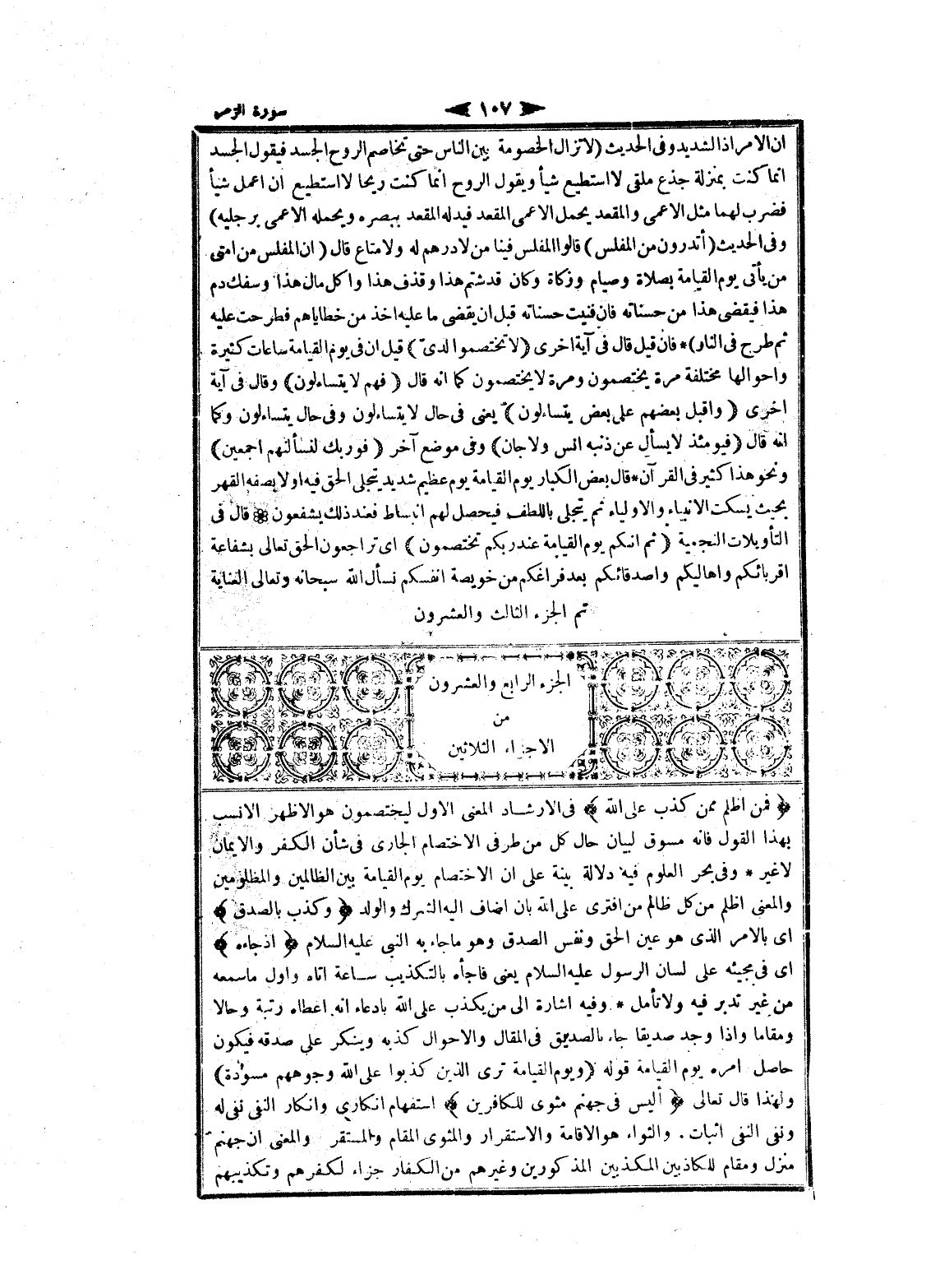 ان الأمر إذ الشديد وفى الحديث (لا تزال الخصومة بين الناس حتى تخاصم الروح الجسد فيقول الجسد انما كنت بمنزلة جذع ملقى لا أستطيع شيأ ويقول الروح انما كنت ريحا لا أستطيع ان اعمل شيأ فضرب لهما مثل الأعمى والمقعد يحمل الأعمى المقعد فيدله المقعد ببصره ويحمله الأعمى برجليه) وفى الحديث (أتدرون من المفلس) قالوا المفلس فينا من لا درهم له ولا متاع قال (ان المفلس من أمتي من يأتى يوم القيامة بصلاة وصيام وزكاة وكان قد شتم هذا وقذف هذا وأكل مال هذا وسفك دم هذا فيقضى هذا من حسناته فان فنيت حسناته قبل ان يقضى ما عليه أخذ من خطاياهم فطرحت عليه ثم طرح فى النار) فان قيل قال فى آية اخرى (لا تَخْتَصِمُوا لَدَيَّ) قيل ان فى يوم القيامة ساعات كثيرة وأحوالها مختلفة مرة يختصمون ومرة لا يختصمون كما انه قال (فَهُمْ لا يَتَساءَلُونَ) وقال فى آية اخرى (وَأَقْبَلَ بَعْضُهُمْ عَلى بَعْضٍ يَتَساءَلُونَ) يعنى فى حال لا يتساءلون وفى حال يتساءلون وكما انه قال (فَيَوْمَئِذٍ لا يُسْئَلُ عَنْ ذَنْبِهِ إِنْسٌ وَلا جَانٌّ) وفى موضع آخر (فَوَ رَبِّكَ لَنَسْئَلَنَّهُمْ أَجْمَعِينَ) ونحو هذا كثير فى القرآن قال بعض الكبار يوم القيامة يوم عظيم شديد يتجلى الحق فيه اولا بصفه القهر بحيث يسكت الأنبياء والأولياء ثم يتجلى باللطف فيحصل لهم انبساط فعند ذلك يشفعون قال فى التأويلات النجمية (ثُمَّ إِنَّكُمْ يَوْمَ الْقِيامَةِ عِنْدَ رَبِّكُمْ تَخْتَصِمُونَ) اى تراجعون الحق تعالى بشفاعة اقربائكم وأهاليكم واصدقائكم بعد فراغكم من خويصة أنفسكم نسأل الله سبحانه وتعالى العناية تم الجزء الثالث والعشرون الجزء الرابع والعشرون من الاجزاء الثلاثين فَمَنْ أَظْلَمُ مِمَّنْ كَذَبَ عَلَى اللَّهِ فى الإرشاد المعنى الاول ليختصمون هو الأظهر الأنسب بهذا القول فانه مسوق لبيان حال كل من طرفى الاختصام الجاري فى شأن الكفر والايمان لا غير وفى بحر العلوم فيه دلالة بينة على ان الاختصام يوم القيامة بين الظالمين والمظلومين والمعنى اظلم من كل ظالم من افترى على الله بان أضاف اليه الشرك والولد وَكَذَّبَ بِالصِّدْقِ اى بالأمر الذي هو عين الحق ونفس الصدق وهو ما جاء به النبي عليه السلام إِذْ جاءَهُ اى فى مجيئه على لسان الرسول عليه السلام يعنى فاجأه بالتكذيب ساعة أتاه وأول ما سمعه من غير تدبر فيه ولا تأمل وفيه اشارة الى من يكذب على الله بادعاء انه أعطاه رتبة وحالا ومقاما وإذا وجد صديقا جاء بالصديق فى المقال والأحوال كذبه وينكر على صدقه فيكون حاصل امره يوم القيامة قوله (وَيَوْمَ الْقِيامَةِ تَرَى الَّذِينَ كَذَبُوا عَلَى اللَّهِ وُجُوهُهُمْ مُسْوَدَّةٌ) ولهذا قال تعالى أَلَيْسَ فِي جَهَنَّمَ مَثْوىً لِلْكافِرِينَ استفهام إنكاري وانكار النفي نفى له ونفى النفي اثبات. والثواء هو الاقامة والاستقرار والمثوى المقام والمستقر. والمعنى ان جهنم منزل ومقام للكاذبين المكذبين المذكورين وغيرهم من الكفار جزاء لكفرهم وتكذيبهم