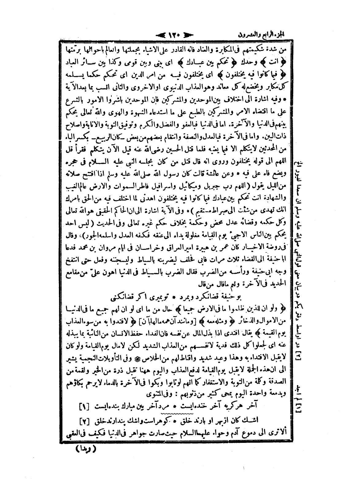 من شدة شكيمتهم فى المكابرة والعناد فانه القادر على الأشياء بجملتها والعالم باحوالها برّمتها أَنْتَ وحدك تَحْكُمُ بَيْنَ عِبادِكَ اى بينى وبين قومى وكذا بين سائر العباد فِي ما كانُوا فِيهِ يَخْتَلِفُونَ اى يختلفون فيه من امر الدين اى تحكم حكما يسلمه كل مكابر ويخضع له كل معاند وهو العذاب الدنيوي او الأخروي والثاني انسب بما بعد الآية وفيه اشارة الى اختلاف بين الموحدين والمشركين فان الموحدين باشروا الأمور بالشرع على ما اقتضاه الأمر والمشركين بالطبع على ما استدعاه الشهوة والهوى والله تعالى يحكم بينهم فى الدنيا والآخرة. اما فى الدنيا فبالعفو والفضل والكرم وتوفيق التوبة والانابة وإصلاح ذات البين. واما فى الآخرة فبالعدل والنصفة وانتقام بعضهم من بعض- كان الربيع- بكسر الباء من المحدثين لا يتكلم الا فيما يعنيه فلما قتل الحسين رضى الله عنه قيل الآن يتكلم فقرأ قل اللهم الى قوله يختلفون وروى انه قال قتل من كان يجلسه النبي عليه السلام فى حجره ويضع فاه على فيه وعن عائشة قالت كان رسول الله صلى الله عليه وسلم إذا افتتح صلاته من الليل يقول (اللهم رب جبريل وميكائيل واسرافيل فاطر السموات والأرض عالم الغيب والشهادة أنت تحكم بين عبادك فيما كانوا فيه يختلفون اهدني لما اختلف فيه من الحق بامرك انك تهدى من شئت الى صراط مستقيم) وفى الآية اشارة الى ان الحاكم الحقيقي هو الله تعالى وكل حكمه وقضائه عدل محض وحكمة بخلاف حكم غيره تعالى وفى الحديث (ليس أحد يحكم بين الناس إلا جيء يوم القيامة مغلولة يداه الى عنقه فكفه العدل وأسلمه الجور) وقال فى روضة الأخيار كان عمر بن هبيرة امير العراق وخراسان فى ايام مروان بن محمد فدعا أبا حنيفة الى القضاء ثلاث مرات فابى فحلف ليضربنه بالسياط وليسجننه وفعل حتى انتفخ وجه ابى حنيفة ورأسه من الضرب فقال الضرب بالسياط فى الدنيا أهون علىّ من مقامع الحديد فى الآخرة ونعم ما قال من قال