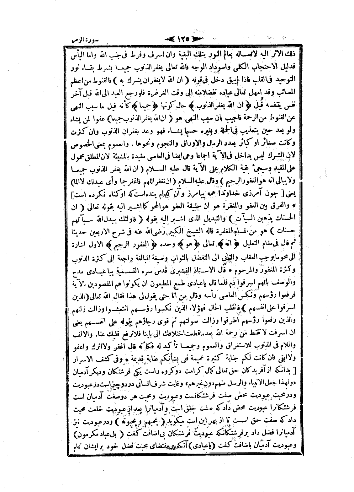 ذلك الأثر اليه لاتصاله بعالم النور بتلك البقية وان أسرف وفرط فى جنب الله واما الياس فدليل الاحتجاب الكلى واسوداد الوجه فالله تعالى يغفر الذنوب جميعا بشرط بقاء نور التوحيد فى القلب فاذا لم يبق دخل فى قوله (إِنَّ اللَّهَ لا يَغْفِرُ أَنْ يُشْرَكَ بِهِ) فالقنوط من أعظم المصائب وقد أمهل تعالى عباده تفضلا منه الى وقت الغرغرة فلو رجع العبد الى الله قبل آخر نفس يتنفسه قبل إِنَّ اللَّهَ يَغْفِرُ الذُّنُوبَ حال كونها جَمِيعاً كأنه قيل ما سبب النهى عن القنوط من الرحمة فاجيب بان سبب النهى هو (إِنَّ اللَّهَ يَغْفِرُ الذُّنُوبَ جَمِيعاً) عفوا لمن يشاء ولو بعد حين بتعذيب فى الجملة وبغيره حسبما يشاء فهو وعد بغفران الذنوب وان كثرت وكانت صغائر او كبائر بعدد الرمال والأوراق والنجوم ونحوها. والعموم بمعنى الخصوص لان الشرك ليس بداخل فى الآية اجماعا وهى ايضا فى العاصي مقيدة بالمشيئة لان المطلق محمول على المقيد وسيجيئ بقية الكلام على الآية قال عليه السلام (ان الله يغفر الذنوب جميعا ولا يبالى انه هو الغفور الرحيم) وقال عليه السلام (ان تغفر اللهم فاغفر جما وأي عبد لك لا الما) يعنى