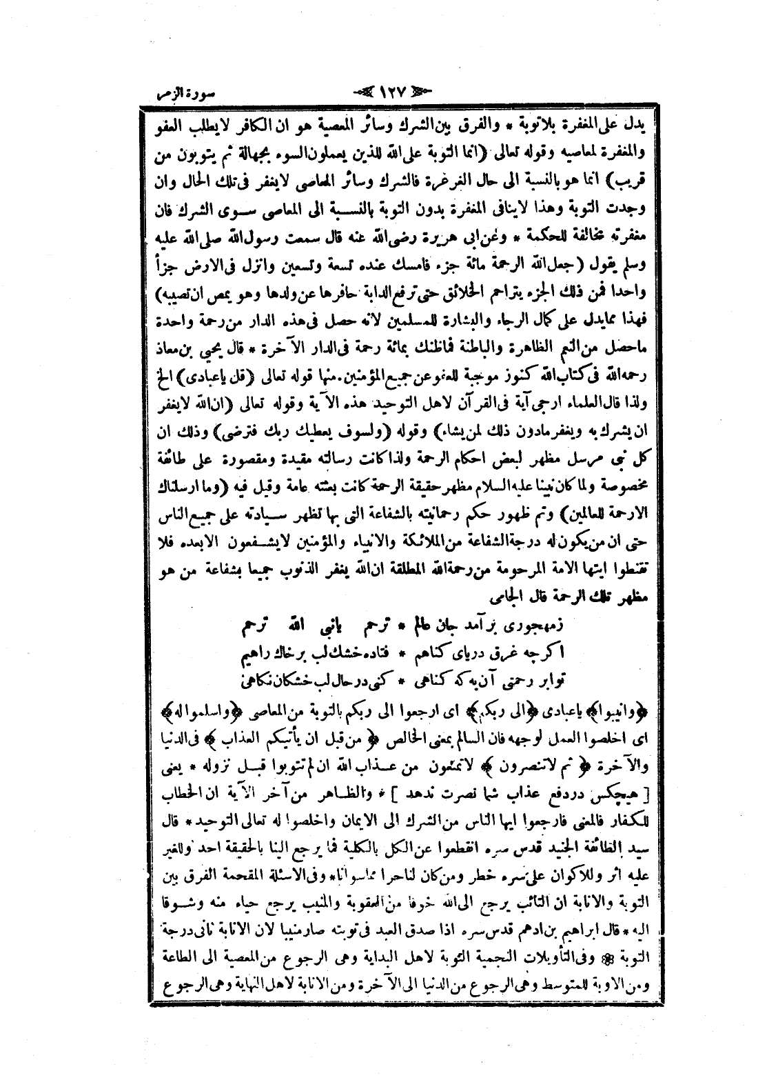 يدل على المغفرة بلا توبة والفرق بين الشرك وسائر المعصية هو ان الكافر لا يطلب العفو والمغفرة لمعاصيه وقوله تعالى (إِنَّمَا التَّوْبَةُ عَلَى اللَّهِ لِلَّذِينَ يَعْمَلُونَ السُّوءَ بِجَهالَةٍ ثُمَّ يَتُوبُونَ مِنْ قَرِيبٍ) انما هو بالنسبة الى حال الغرغرة فالشرك وسائر المعاصي لا يغفر فى تلك الحال وان وجدت التوبة وهذا لا ينافى المغفرة بدون التوبة بالنسبة الى المعاصي سوى الشرك فان مغفرته مخالفة للحكمة وعن ابى هريرة رضى الله عنه قال سمعت رسول الله صلى الله عليه وسلم يقول (جعل الله الرحمة مائة جزء فامسك عنده تسعة وتسعين وانزل فى الأرض جزأ واحدا فمن ذلك الجزء يتراحم الخلائق حتى ترفع الدابة حافرها عن ولدها وهو يمص ان تصيبه) فهذا مما يدل على كمال الرجاء والبشارة للمسلمين لانه حصل فى هذه الدار من رحمة واحدة ما حصل من النعم الظاهرة والباطنة فما ظنك بمائة رحمة فى الدار الآخرة قال يحيى بن معاذ رحمه الله فى كتاب الله كنوز موجبة للعفو عن جميع المؤمنين. منها قوله تعالى (قُلْ يا عِبادِيَ) إلخ ولذا قال العلماء أرجى آية فى القرآن لاهل التوحيد هذه الآية وقوله تعالى (إِنَّ اللَّهَ لا يَغْفِرُ أَنْ يُشْرَكَ بِهِ وَيَغْفِرُ ما دُونَ ذلِكَ لِمَنْ يَشاءُ) وقوله (وَلَسَوْفَ يُعْطِيكَ رَبُّكَ فَتَرْضى) وذلك ان كل نبى مرسل مظهر لبعض احكام الرحمة ولذا كانت رسالته مقيدة ومقصورة على طائفة مخصوصة ولما كان نبينا عليه السلام مظهر حقيقة الرحمة كانت بعثته عامة وقيل فيه (وَما أَرْسَلْناكَ إِلَّا رَحْمَةً لِلْعالَمِينَ) وتم ظهور حكم رحمانيته بالشفاعة التي بها تظهر سيادته على جميع الناس حتى ان من يكون له درجة الشفاعة من الملائكة والأنبياء والمؤمنين لا يشفعون الا بعده فلا تقنطوا أيتها الامة المرحومة من رحمة الله المطلقة ان الله يغفر الذنوب جميعا بشفاعة من هو مظهر تلك الرحمة قال الجامى