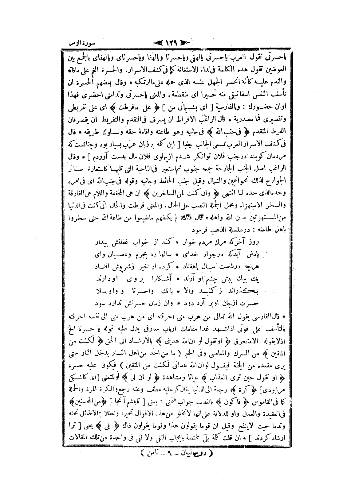 يا حسرتى تقول العرب يا حسرتى يا لهفى ويا حسرتا ويا لهفا ويا حسرتاى ويا لهفاى بالجمع بين العوضين تقول هذه الكلمة فى نداء الاستغاثة كما فى كشف الاسرار. والحسرة الغم على ما فاته والندم عليه كأنه انحسر الجهل عنه الذي حمله على ما ارتكبه وقال بعضهم الحسرة ان تأسف النفس أسفا تبقى منه حسيرا اى منقطعة. والمعنى يا حسرتى وندامتى احضرى فهذا أوان حضورك: وبالفارسية [اى پشيمانى من] عَلى ما فَرَّطْتُ اى على تفريطى وتقصيرى فما مصدرية قال الراغب الافراط ان يسرف فى التقدم والتفريط ان يقصر فان الفرط المتقدم فِي جَنْبِ اللَّهِ فى جانبه وهو طاعته واقامة حقه وسلوك طريقه قال فى كشف الاسرار العرب تسمى الجانب جنبا [اين كلمه بر زبان عرب بسيار بود و چنانست كه مردمان كويند در جنب فلان توانكر شدم از پهلوى فلان مال بدست آوردم] وقال الراغب اصل الجنب الجارحة جمعه جنوب ثم استعير فى الناحية التي تليها كاستعارة سائر الجوارح لذلك نحو اليمين والشمال وقيل جنب الحائط وجانبه وقوله فى جنب الله اى فى امره وحده الذي حده لنا انتهى وَإِنْ كُنْتُ لَمِنَ السَّاخِرِينَ ان هى المخففة واللام هى الفارقة والسخر الاستهزاء ومحل الجملة النصب على الحال. والمعنى فرطت والحال انى كنت فى الدنيا من المستهزئين بدين الله واهله قال قتادة لم يكفهم ما ضيعوا من طاعة الله حتى سخروا باهل طاعته: در سلسلة الذهب فرمود