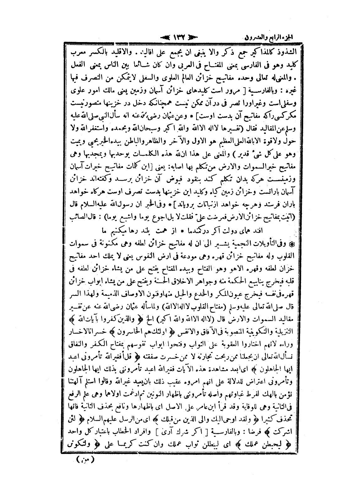 الشذوذ كالمذاكير جمع ذكر والا ينبغى ان يجمع على أقاليد. والاقليد بالكسر معرب كليد وهو فى الفارسي بمعنى المفتاح فى العربي وان كان شائعا بين الناس بمعنى الفعل. والمعنى له تعالى وحده مفاتيح خزائن العالم العلوي والسفلى لا يتمكن من التصرف فيها غيره: وبالفارسية [مرور است كليدهاى خزائن آسمان وزمين يعنى مالك امور علوى وسفلى است وغير او را تصرفى در آن ممكن نيست همچنانكه دخل در خزينها متصور نيست مكر كسى را كه مفاتيح آن بدست اوست] وعن عثمان رضى الله عنه انه سأل النبي صلى الله عليه وسلم عن المقاليد فقال (تفسيرها لا اله الا الله والله اكبر وسبحان الله وبحمده واستغفر الله ولا حول ولا قوة الا بالله العلى العظيم هو الاول والآخر والظاهر والباطن بيده الخير يحيى ويميت وهو على كل شىء قدير) والمعنى على هذا ان لله هذه الكلمات يوحد بها ويمجد بها وهى مفاتيح خير السموات والأرض من تكلم بها أصابه: يعنى [اين كلمات مفاتيح خيرات آسمان وزمينست هر كه بدان تكلم كند بنقود فيوض آن خزائن برسد وكفته اند خزائن آسمان بارانست وخزائن زمين كياه وكليد اين خزينها بدست تصرف اوست هركاه خواهد باران فرستد وهر چهـ خواهد از نباتات بروياند] وفى الخبر ان رسول الله عليه السلام قال (أتيت بمفاتيح خزائن الأرض فعرضت علىّ فقلت لا بل أجوع يوما وأشبع يوما) : قال الصائب