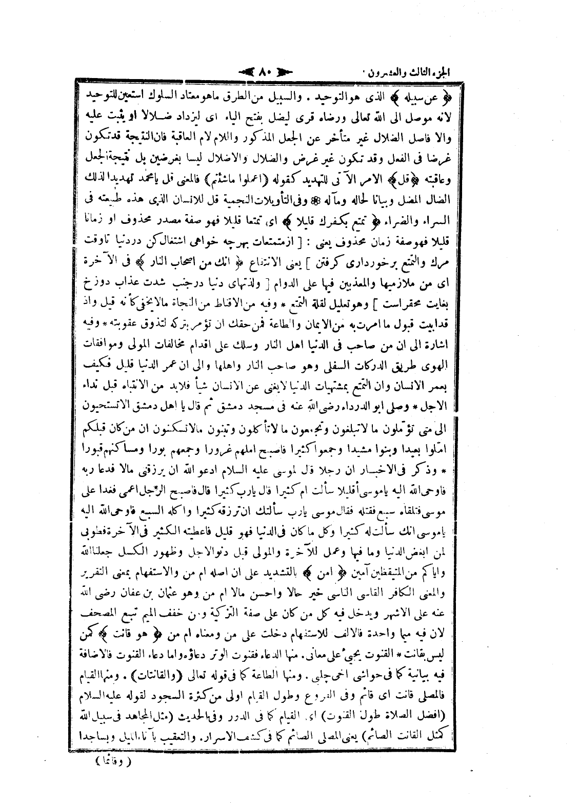 عَنْ سَبِيلِهِ الذي هو التوحيد. والسبيل من الطرق ما هو معتاد السلوك استعين للتوحيد لانه موصل الى الله تعالى ورضاه قرى ليضل بفتح الياء اى ليزداد ضلالا او يثبت عليه والا فاصل الضلال غير متأخر عن الجعل المذكور واللام لام العاقبة فان النتيجة قد تكون غرضا فى الفعل وقد تكون غير غرض والضلال والإضلال ليسا بغرضين بل نتيجة الجعل وعاقبته قُلْ الأمر الآتي للتهديد كقوله (اعْمَلُوا ما شِئْتُمْ) فالمعنى قل يا محمد تهديدا لذلك الضال المضل وبيانا لحاله ومآله وفى التأويلات النجمية قل للانسان الذي هذه طبيعته فى السراء والضراء تَمَتَّعْ بِكُفْرِكَ قَلِيلًا اى تمتعا قليلا فهو صفة مصدر محذوف او زمانا قليلا فهو صفة زمان محذوف يعنى: [از متمتعات بهر چهـ خواهى اشتغال كن در دنيا تا وقت مرك والتمتع برخوردارى كرفتن] يعنى الانتفاع إِنَّكَ مِنْ أَصْحابِ النَّارِ فى الآخرة اى من ملازميها والمعذبين فيها على الدوام [ولذتهاى دنيا در جنب شدت عذاب دوزخ بغايت محقر است] وهو تعليل لقلة التمتع وفيه من الاقناط من النجاة ما لا يخفى كأنه قيل وإذ قدا بيت قبول ما أمرت به من الايمان والطاعة فمن حقك ان تؤمر بتركه لتذوق عقوبته وفيه اشارة الى ان من صاحب فى الدنيا اهل النار وسلك على أقدام مخالفات المولى وموافقات الهوى طريق الدركات السفلى وهو صاحب النار وأهلها والى ان عمر الدنيا قليل فكيف بعمر الإنسان وان التمتع بمشتهيات الدنيا لا يغنى عن الإنسان شيأ فلا بد من الانتباه قبل نداء الاجل وصلى ابو الدرداء رضى الله عنه فى مسجد دمشق ثم قال يا اهل دمشق الا تستحيون الى متى تؤمّلون ما لا تبلغون وتجمعون ما لا تأكلون وتبنون ما لا تسكنون ان من كان قبلكم امّلوا بعيدا وبنوا مشيدا وجمعوا كثيرا فاصبح أملهم غرورا وجمعهم بورا ومساكنهم قبورا وذكر فى الاخبار ان رجلا قال لموسى عليه السلام ادعو الله ان يرزقنى ما لا فدعا ربه فاوحى الله اليه يا موسى أقليلا سألت أم كثيرا قال يا رب كثيرا قال فاصبح الرجل أعمى فغدا على موسى فتلقاه سبع فقتله فقال موسى يا رب سألتك ان ترزقه كثيرا وأكله السبع فاوحى الله اليه يا موسى انك سألت له كثيرا وكل ما كان فى الدنيا فهو قليل فاعطيته الكثير فى الآخرة فطوبى لمن ابغض الدنيا وما فيها وعمل للآخرة والمولى قبل دنو الاجل وظهور الكسل جعلنا الله وإياكم من المتيقظين آمين أَمَّنْ بالتشديد على ان أصله أم من والاستفهام بمعنى التقرير والمعنى الكافر القاسي الناسي خير حالا واحسن مالا أم من وهو عثمان بن عفان رضى الله عنه على الأشهر ويدخل فيه كل من كان على صفة التزكية ومن خفف الميم تبع المصحف لان فيه ميما واحدة فالالف للاستفهام دخلت على من ومعناه أم من هُوَ قانِتٌ كمن ليس بقانت القنوت يجيىء على معانى. منها الدعاء فقنوت الوتر دعاؤه واما دعاء القنوت فالاضافة فيه بيانية كما فى حواشى أخي چلبى. ومنها الطاعة كما فى قوله تعالى (وَالْقانِتاتِ) . ومنها القيام فالمصلى قانت اى قائم وفى الفروع وطول القيام اولى من كثرة السجود لقوله عليه السلام (أفضل الصلاة طول القنوت) اى القيام كما فى الدرر وفى الحديث (مثل المجاهد فى سبيل الله كمثل القانت الصائم) يعنى المصلى الصائم كما فى كشف الاسرار. والتعقيب بآناء الليل وبساجدا