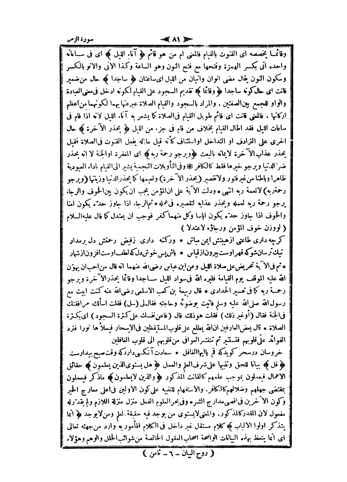 ثم فى الآية تحريض على صلاة الليل وعن ابن عباس رضى الله عنهما انه قال من أحب ان يهوّن الله عليه الموقف يوم القيامة فليره الله فى سواد الليل ساجدا وقائما يحذر الآخرة ويرجو رحمة ربه كما فى تفسير الحدادي قال ربيعة بن كعب الأسلمي رضى الله عنه كنت أبيت مع رسول الله صلى الله عليه وسلم فاتيت بوضوئه وحاجته فقال لى (سل) فقلت اسألك مرافقتك فى الجنة فقال (أو غير ذلك) فقلت هو ذلك قال (فاعن نفسك على كثرة السجود) اى بكثرة الصلاة قال بعض العارفين ان الله يطلع على قلوب المستيقظين فى الاسحار فيملأها نورا فترد الفوائد على قلوبهم فتستنير ثم تنتشر العوافي من قلوبهم الى قلوب الغافلين