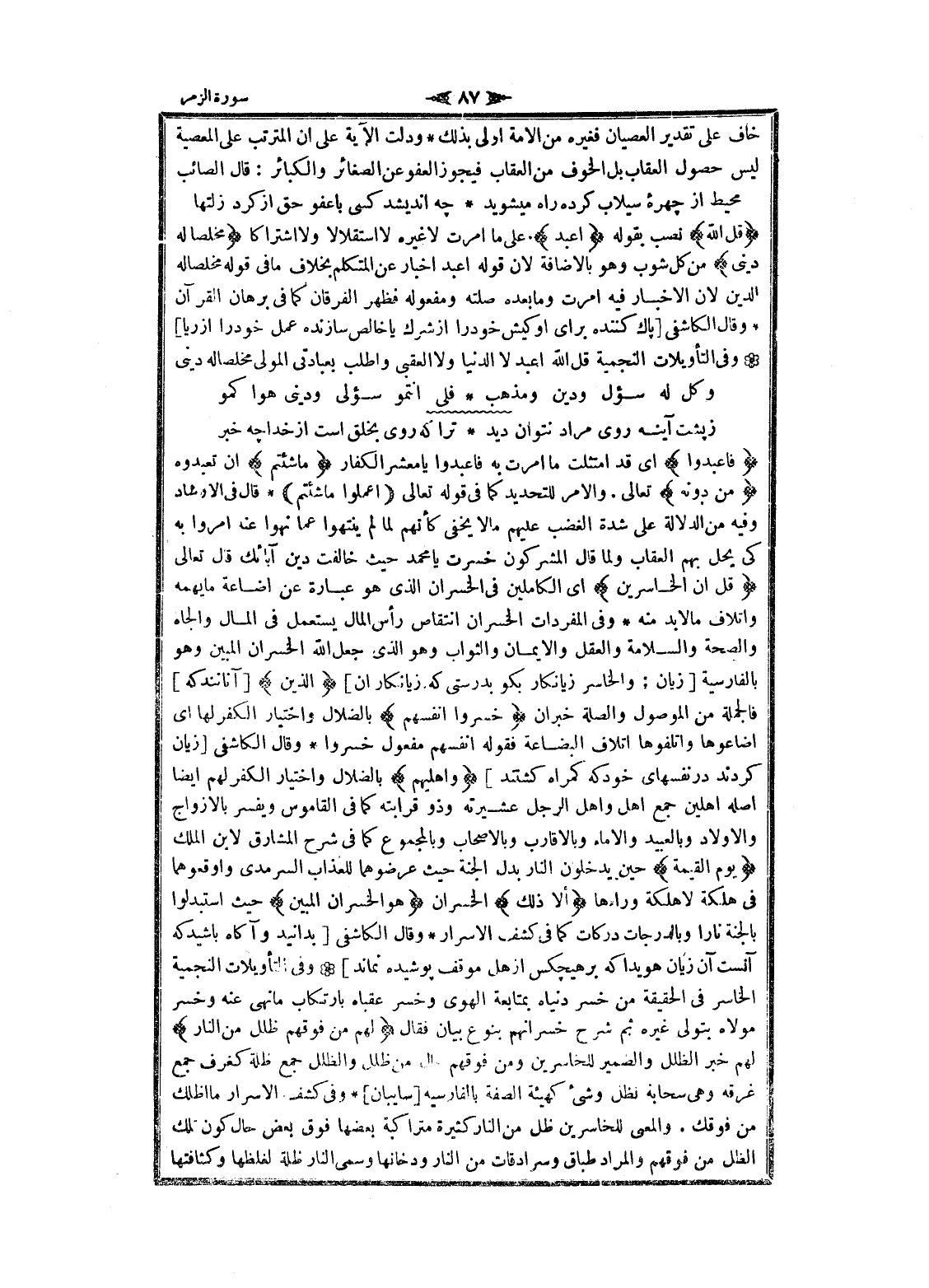 فَاعْبُدُوا اى قد امتثلت ما أمرت به فاعبدوا يا معشر الكفار ما شِئْتُمْ ان تعبدوه مِنْ دُونِهِ تعالى. والأمر للتحديد كما فى قوله تعالى (اعْمَلُوا ما شِئْتُمْ) قال فى الإرشاد وفيه من الدلالة على شدة الغضب عليهم ما لا يخفى كأنهم لما لم ينتهوا عما نهوا عنه أمروا به كى يحل بهم العقاب ولما قال المشركون خسرت يا محمد حيث خالفت دين آبائك قال تعالى قُلْ إِنَّ الْخاسِرِينَ اى الكاملين فى الخسران الذي هو عبارة عن اضاعة ما يهمه وإتلاف ما لا بد منه وفى المفردات الخسران انتقاص رأس المال يستعمل فى المال والجاه والصحة والسلامة والعقل والايمان والثواب وهو الذي جعل الله الخسران المبين وهو بالفارسية [زيان: والخاسر زيانكار بگو بدرستى كه زيانكاران] الَّذِينَ [آنانند كه] فالجملة من الموصول والصلة خبران خَسِرُوا أَنْفُسَهُمْ بالضلال واختيار الكفر لها اى أضاعوها واتلفوها إتلاف البضاعة فقوله أنفسهم مفعول خسروا وقال الكاشفى [زيان كردند در نفسهاى خود كه كمراه كشتند] وَأَهْلِيهِمْ بالضلال واختيار الكفر لهم ايضا أصله أهلين جمع اهل واهل الرجل عشيرته وذو قرابته كما فى القاموس ويفسر بالأزواج والأولاد وبالعبيد والإماء وبالأقارب وبالاصحاب وبالمجموع كما فى شرح المشارق لابن الملك يَوْمَ الْقِيامَةِ حين يدخلون النار بدل الجنة حيث عرضوهما للعذاب السرمدي واوقعوهما فى هلكة لاهلكة وراءها أَلا ذلِكَ الخسران هُوَ الْخُسْرانُ الْمُبِينُ حيث استبدلوا بالجنة نارا وبالدرجات دركات كما فى كشف الاسرار وقال الكاشفى [بدانيد وآگاه باشيد كه آنست آن زيان هويدا كه بر هيچكس از هل موقف پوشيده نماند] وفى التأويلات النجمية الخاسر فى الحقيقة من خسر دنياه بمتابعة الهوى وخسر عقباه بارتكاب ما نهى عنه وخسر مولاه بتولي غيره ثم شرح خسرانهم بنوع بيان فقال لَهُمْ مِنْ فَوْقِهِمْ ظُلَلٌ مِنَ النَّارِ لهم خبر الظلل والضمير للخاسرين ومن فوقهم حال من ظلل والظلل جمع ظلة كغرف جمع غرقه وهى سحابه نظل وشىء كهيئة الصفة بالفارسية [سايبان] وفى كشف الاسرار ما اظلك من فوقك. والمعنى للخاسرين ظل من النار كثيرة متراكبة بعضها فوق بعض حال كون تلك الظل من فوقهم والمراد طباق وسرادقات من النار ودخانها وسمى النار ظلة لغلظها وكثافتها