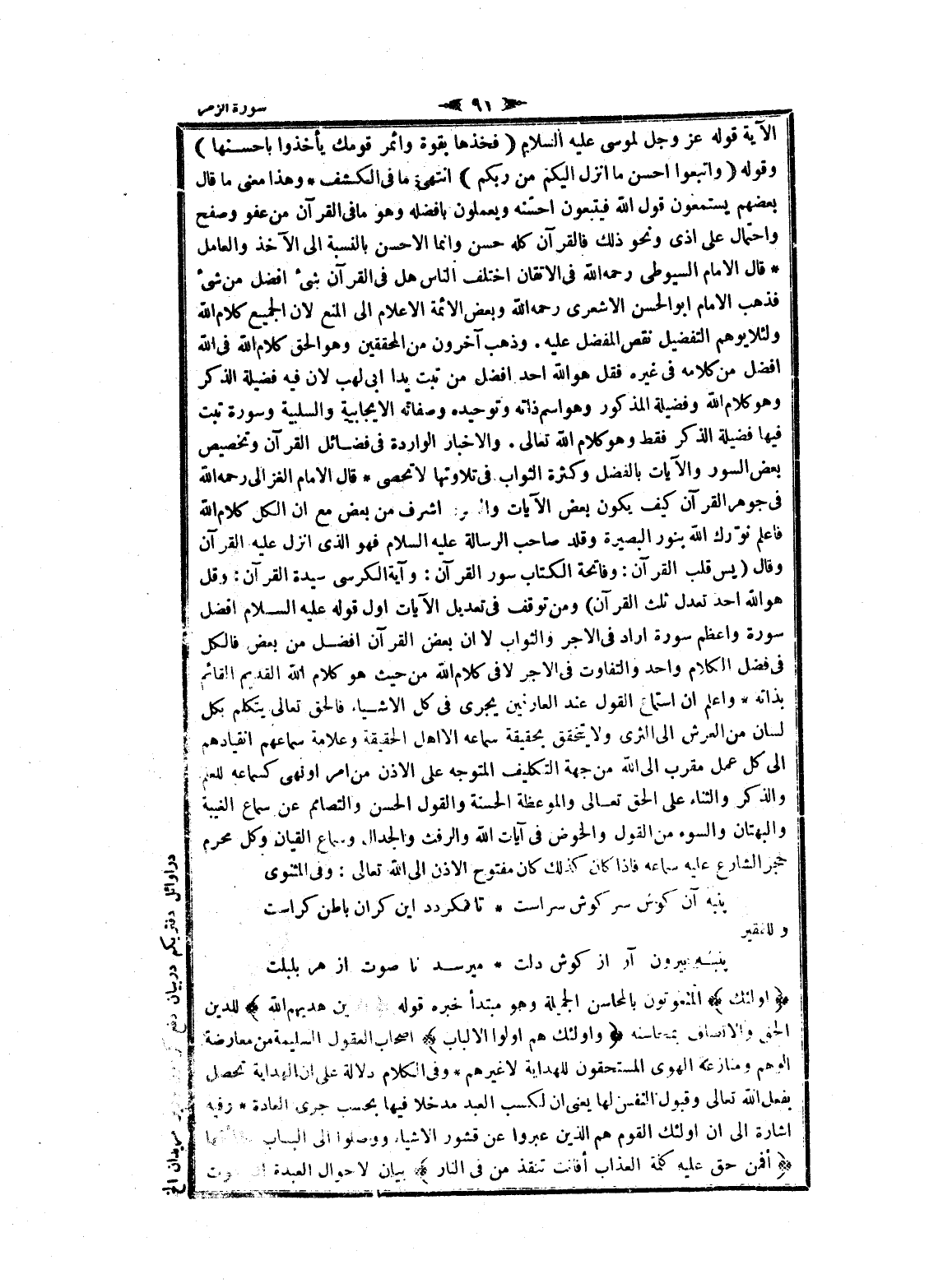 الآية قوله عز وجل لموسى عليه السلام (فَخُذْها بِقُوَّةٍ وَأْمُرْ قَوْمَكَ يَأْخُذُوا بِأَحْسَنِها) وقوله (وَاتَّبِعُوا أَحْسَنَ ما أُنْزِلَ إِلَيْكُمْ مِنْ رَبِّكُمْ) انتهى ما فى الكشف وهذا معنى ما قال بعضهم يستمعون قول الله فيتبعون أحسنه ويعملون بأفضله وهو ما فى القرآن من عفو وصفح واحتمال على أذى ونحو ذلك فالقرآن كله حسن وانما الأحسن بالنسبة الى الآخذ والعامل قال الامام السيوطي رحمه الله فى الإتقان اختلف الناس هل فى القرآن شىء أفضل من شىء فذهب الامام ابو الحسن الأشعري رحمه الله وبعض الائمة الاعلام الى المنع لان الجميع كلام الله ولئلا يوهم التفضيل نقص المفضل عليه. وذهب آخرون من المحققين وهو الحق كلام الله فى الله أفضل من كلامه فى غيره فقل هو الله أحد أفضل من تبت يدا ابى لهب لان فيه فضيلة الذكر وهو كلام الله وفضيلة المذكور وهو اسم ذاته وتوحيده وصفاته الايجابية والسلبية وسورة تبت فيها فضيلة الذكر فقط وهو كلام الله تعالى. والاخبار الواردة فى فضائل القرآن وتخصيص بعض السور والآيات بالفضل وكثرة الثواب فى تلاوتها لا تحصى قال الامام الغزالي رحمه الله فى جوهر القرآن كيف يكون بعض الآيات والسور اشرف من بعض مع ان الكل كلام الله فاعلم نوّرك الله بنور البصيرة وقلد صاحب الرسالة عليه السلام فهو الذي انزل عليه القرآن وقال (پس قلب القرآن: وفاتحة الكتاب سور القرآن: وآية الكرسي سيدة القرآن: وقل هو الله أحد تعدل ثلث القرآن) ومن توقف فى تعديل الآيات أول قوله عليه السلام أفضل سورة وأعظم سورة أراد فى الاجر والثواب لا ان بعض القرآن أفضل من بعض فالكل فى فضل الكلام واحد والتفاوت فى الاجر لافى كلام الله من حيث هو كلام الله القديم القائم بذاته واعلم ان استماع القول عند العارفين يجرى فى كل الأشياء فالحق تعالى يتكلم بكل لسان من العرش الى الثرى ولا يتحقق بحقيقة سماعه الا اهل الحقيقة وعلامة سماعهم انقيادهم الى كل عمل مقرب الى الله من جهة التكليف المتوجه على الاذن من امر او نهى كسماعه للعلم والذكر والثناء على الحق تعالى والموعظة الحسنة والقول الحسن والتصامم عن سماع الغيبة والبهتان والسوء من القول والخوض فى آيات الله والرفث والجدال وسماع القيان وكل محرم حجر الشارع عليه سماعه فاذا كان كذلك كان مفتوح الاذن الى الله تعالى: وفى المثنوى