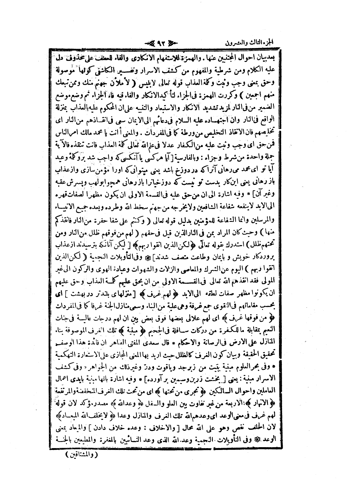 بعد بيان احوال المجتنبين عنها. والهمزة للاستفهام الإنكاري والفاء للعطف على محذوف دل عليه الكلام ومن شرطية والمفهوم من كشف الاسرار وتفسير الكاشفى كونها موصولة وحق بمعنى وجب وثبت وكلمة العذاب قوله تعالى لابليس (لَأَمْلَأَنَّ جَهَنَّمَ مِنْكَ وَمِمَّنْ تَبِعَكَ مِنْهُمْ أَجْمَعِينَ) وكررت الهمزة فى الجزاء لتأكيد الإنكار والفاء فيه فاء الجزاء ثم وضع موضع الضمير من فى النار لمزيد تشديد الإنكار والاستبعاد والتنبيه على ان المحكوم عليه بالعذاب بمنزلة الواقع فى النار وان اجتهاده عليه السلام فى دعائهم الى الايمان سعى فى إنقاذهم من النار اى تخليصهم فان الانقاذ التخليص من ورطة كما فى المفردات. والمعنى أأنت يا محمد مالك امر الناس فمن حق اى وجب وثبت عليه من الكفار عدلا فى علم الله تعالى كلمة العذاب فانت تنقذه فالآية جملة واحدة من شرط وجزاء: وبالفارسية [آيا هر كسى يا آنكسى كه واجب شد برو كلمه وعيد آيا تو اى محمد مى رهانى آنرا كه در دوزخ باشد يعنى ميتوانى كه او را مؤمن سازى واز عذاب باز رهانى يعنى اين كار بدست تو نيست كه دوزخيانرا باز رهانى همچوابو لهب و پسرش عقبه وغير آن] . وفيه اشارة الى ان من حق عليه فى القسمة الاولى ان يكون مظهرا لصفات قهره الى الابد لا ينفعه شفاعة الشافعين ولا يخرجه من جهنم سخط الله وطرده وبعده جميع الأنبياء والمرسلين وانما الشفاعة للمؤمنين بدليل قوله تعالى (وَكُنْتُمْ عَلى شَفا حُفْرَةٍ مِنَ النَّارِ فَأَنْقَذَكُمْ مِنْها) وحيث كان المراد بمن فى النار الذين قيل فى حقهم (لَهُمْ مِنْ فَوْقِهِمْ ظُلَلٌ مِنَ النَّارِ وَمِنْ تَحْتِهِمْ ظُلَلٌ) استدرك بقوله تعالى لكِنِ الَّذِينَ اتَّقَوْا رَبَّهُمْ [ليكن آنانكه بترسيدند از عذاب پروردگار خويش وبايمان وطاعت متصف شدند] وفى التأويلات النجمية (لكِنِ الَّذِينَ اتَّقَوْا رَبَّهُمْ) اليوم عن الشرك والمعاصي والزلات والشهوات وعبادة الهوى والركون الى غير المولى فقد انقذهم الله تعالى فى القسمة الاولى من ان يحق عليهم كلمة العذاب وحق عليهم ان يكونوا مظهر صفات لطقه الى الابد لَهُمْ غُرَفٌ [منزلهاى بلندتر در بهشت] اى بحسب مقاماتهم فى التقوى جمع غرفة وهى علية من البناء وسمى منازل الجنة غرفا كما فى المفردات مِنْ فَوْقِها غُرَفٌ اى لهم علالى بعضها فوق بعض بين ان لهم درجات عالية فى جنات النعيم بمقابلة ما للكفرة من دركات سافلة فى الجحيم مَبْنِيَّةٌ تلك الغرف الموصوفة بناء المنازل على الأرض فى الرصانة والاحكام قال سعدى المفتى الظاهر ان فائدة هذا الوصف تحقيق الحقيقة وبيان كون الغرف كالظلل حيث أريد بها المعنى المجازى على الاستعارة التهكمية وفى بحر العلوم مبنية ببيت من زبرجد وياقوت ودرّ وغير ذلك من الجواهر وفى كشف الاسرار مبنية: يعنى [بخشت زرين وسيمين برآورده] وفيه اشارة بانها مبنية بايدى اعمال العاملين واحوال السالكين تَجْرِي مِنْ تَحْتِهَا اى من تحت تلك الغرف المنخفضة والمرتفعة الْأَنْهارُ الاربعة من غير تفاوت بين العلو والسفل وَعْدَ اللَّهِ مصدر مؤكد لان قوله لهم غرف فى معنى الوعد اى وعدهم الله تلك الغرف والمنازل وعدا لا يُخْلِفُ اللَّهُ الْمِيعادَ لان الخلف نقص وهو على الله محال [والأخلاف: وعده خلاف دادن] والميعاد بمعنى الوعد وفى التأويلات النجمية وعد الله الذي وعد التائبين بالمغفرة والمطيعين بالجنة
