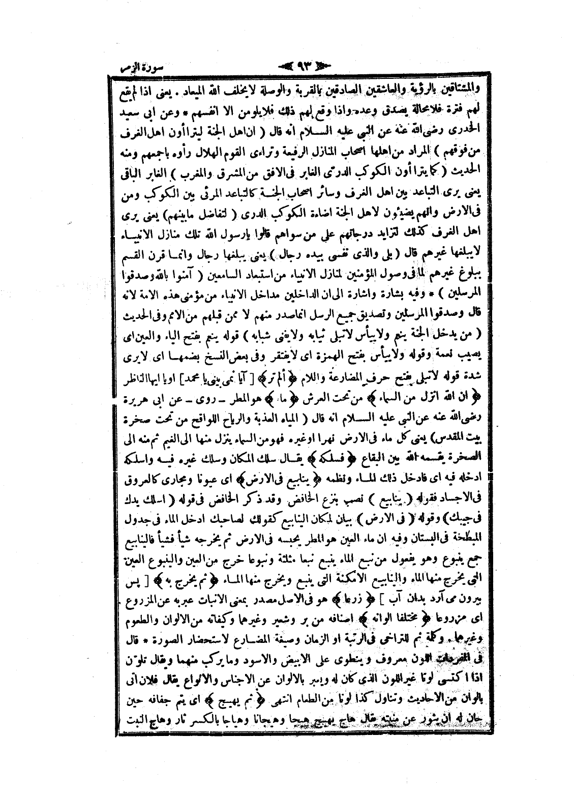 والمشتاقين بالرؤية والعاشقين الصادقين بالقربة والوصلة لا يخلف الله الميعاد. يعنى إذا لم يقع لهم فترة فلا محالة يصدق وعده وإذا وقع لهم ذلك فلا يلومن الا أنفسهم وعن ابى سعيد الخدري رضى الله عنه عن النبي عليه السلام انه قال (ان اهل الجنة ليتراءون اهل الغرف من فوقهم) المراد من أهلها اصحاب المنازل الرفيعة وتراءى القوم الهلال رأوه بأجمعهم ومنه الحديث (كما يتراءون الكوكب الدرّى الغابر فى الأفق من المشرق والمغرب) الغابر الباقي يعنى يرى التباعد بين اهل الغرف وسائر اصحاب الجنة كالتباعد المرئي بين الكوكب ومن فى الأرض وانهم يضيئون لاهل الجنة اضاءة الكوكب الدري (لتفاضل ما بينهم) يعنى يرى اهل الغرف كذلك لتزايد درجاتهم على من سواهم قالوا يا رسول الله تلك منازل الأنبياء لا يبلغها غيرهم قال (بلى والذي نفسى بيده رجال) يعنى يبلغها رجال وانما قرن القسم ببلوغ غيرهم لما فى وصول المؤمنين لمنازل الأنبياء من استبعاد السامعين (آمنوا بالله وصدقوا المرسلين) وفيه بشارة واشارة الى ان الداخلين مداخل الأنبياء من مؤمنى هذه الامة لانه قال وصدقوا المرسلين وتصديق جميع الرسل انما صدر منهم لا ممن قبلهم من الأمم وفى الحديث (من يدخل الجنة ينعم ولا ييأس لا تبلى ثيابه ولا يفنى شبابه) قوله ينعم بفتح الياء والعين اى يصيب نعمة وقوله ولا ييأس بفتح الهمزة اى لا يفتقر وفى بعض النسخ بضمها اى لا يرى شدة قوله لا تبلى بفتح حرف المضارعة واللام أَلَمْ تَرَ [آيا نمى بينى يا محمد] او يا ايها الناظر أَنَّ اللَّهَ أَنْزَلَ مِنَ السَّماءِ من تحت العرش ماءً هو المطر- روى- عن ابى هريرة رضى الله عنه عن النبي عليه السلام انه قال (المياه العذبة والرياح اللواقح من تحت صخرة بيت المقدس) يعنى كل ماء فى الأرض نهرا او غيره فهو من السماء ينزل منها الى الغيم ثم منه الى الصخرة يقسمه الله بين البقاع فَسَلَكَهُ يقال سلك المكان وسلك غيره فيه واسلكه ادخله فيه اى فادخل ذلك الماء ونظمه يَنابِيعَ فِي الْأَرْضِ اى عيونا ومجارى كالعروق فى الأجساد فقوله (يَنابِيعَ) نصب بنزع الخافض وقد ذكر الخافض فى قوله (اسْلُكْ يَدَكَ فِي جَيْبِكَ) وقوله (فِي الْأَرْضِ) بيان لمكان الينابيع كقولك لصاحبك ادخل الماء فى جدول المبطخة فى البستان وفيه ان ماء العين هو المطر يحبسه فى الأرض ثم يخرجه شيأ فشيأ فالينابيع جمع ينبوع وهو يفعول من نبع الماء ينبع نبعا مثلثة ونبوعا خرج من العين والينبوع العين التي يخرج منها الماء والينابيع الامكنة التي ينبع ويخرج منها الماء ثُمَّ يُخْرِجُ بِهِ [پس بيرون مى آرد بدان آب] زَرْعاً هو فى الأصل مصدر بمعنى الإنبات عبر به عن المزروع اى مزروعا مُخْتَلِفاً أَلْوانُهُ اصنافه من بر وشعير وغيرهما وكيفياته من الألوان والطعوم وغيرهما. وكلمة ثم للتراخى فى الرتبة او الزمان وصيغة المضارع لاستحضار الصورة قال فى المفردات اللون معروف وينطوى على الأبيض والأسود وما يركب منهما ويقال تلوّن إذا اكتسى لونا غير اللون الذي كان له ويعبر بالألوان عن الأجناس والأنواع يقال فلان اتى بألوان من الأحاديث وتناول كذا لونا من الطعام انتهى ثُمَّ يَهِيجُ اى يتم جفافه حين حان له ان يثور عن منبته يقال هاج يهيج هيجا وهيجانا وهياجا بالكسر ثار وهاج النبت