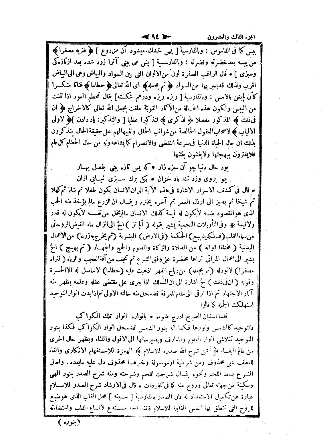 يبس كما فى القاموس: وبالفارسية [پس خشك ميشود آن مزروع] فَتَراهُ مُصْفَرًّا من يبسه بعد خضرته ونضرته: وبالفارسية [پس مى بينى آنرا زرد شده بعد از تازگى وسبزى] قال الراغب الصفرة لون من الألوان التي بين السواد والبياض وهى الى البياض اقرب ولذلك قد يعبر بها عن السواد ثُمَّ يَجْعَلُهُ اى الله تعالى حُطاماً فتاتا متكسرا كأن لم يغن بالأمس: وبالفارسية [ريزه ريزه ودرهم شكسته] يقال تحطم العود إذا تفتت من اليبس ولكون هذه الحالة من الآثار القوية علقت بجعل الله تعالى كالاخراج إِنَّ فِي ذلِكَ المذكور مفصلا لَذِكْرى لتذكيرا عظيما [والتذكير: ياد دادن] لِأُولِي الْأَلْبابِ لاصحاب العقول الخالصة من شوائب الخلل وتنبيها لهم على حقيقة الحال يتذكرون بذلك ان حال الحياة الدنيا فى سرعة التقضي والانصرام كما يشاهدونه من حال الحطام كل عام فلا يغترون ببهجتها ولا يفتنون بفتنها