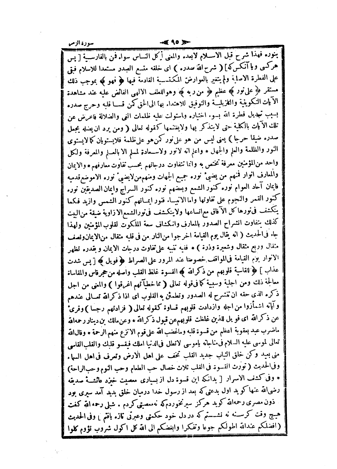 بنوره فهذا شرح قبل الإسلام لا بعده والمعنى أكل الناس سواء فمن بالفارسية [پس هر كسى ويا آنكس كه] (شَرَحَ اللَّهُ صَدْرَهُ) اى خلقه متسع الصدر مستعدا للاسلام فبقى على الفطرة الاصلية ولم يتغير بالعوارض المكتسبة القادمة فيها فَهُوَ بموجب ذلك مستقر عَلى نُورٍ عظيم مِنْ رَبِّهِ وهو اللطف الإلهي الفائض عليه عند مشاهدة الآيات التكوينية والتنزيلية والتوفيق للاهتداء بها الى الحق كمن قسا قلبه وحرج صدره بسبب تبديل فطرة الله بسوء اختياره واستولت عليه ظلمات الغى والضلالة فاعرض عن تلك الآيات بالكلية حتى لا يتذكر بها ولا يغتنمها كقوله تعالى (وَمَنْ يُرِدْ أَنْ يُضِلَّهُ يَجْعَلْ صَدْرَهُ ضَيِّقاً حَرَجاً) يعنى ليس من هو على نور كمن هو على ظلمة فلا يستويان كما لا يستوى النور والظلمة والعلم والجهل واعلم انه لا نور ولا سعادة لمسلم الا بالعلم والمعرفة ولكل واحد من المؤمنين معرفة تختص به وانما تتفاوت درجاتهم بحسب تفاوت معارفهم والايمان والمعارف أنوار فمنهم من يضىء نوره جميع الجهات ومنهم من لا يضىء نوره الا موضع قدميه فايمان آحاد العوام نوره كنور الشمع وبعضهم نوره كنور السراج وايمان الصديقين نوره كنور القمر والنجوم على تفاوتها واما الأنبياء فنور ايمانهم كنور الشمس وأزيد فكما ينكشف فى نورها كل الآفاق مع اتساعها ولا ينكشف فى نور الشمع الا زاوية ضيقة من البيت كذلك يتفاوت انشراح الصدور بالمعارف وانكشاف سعة الملكوت لقلوب المؤمنين ولهذا جاء فى الحديث (انه يقال يوم القيامة اخرجوا من النار من فى قلبه مثقال من الايمان ونصف مثقال وربع مثقال وشعيرة وذرة) ففيه تنبيه على تفاوت درجات الايمان وبقدره تظهر الأنوار يوم القيامة فى المواقف خصوصا عند المرور على الصراط فَوَيْلٌ [پس شدت عذاب] لِلْقاسِيَةِ قُلُوبُهُمْ مِنْ ذِكْرِ اللَّهِ القسوة غلظ القلب وأصله من حجر قاس والمقاساة معالجة ذلك ومن اجلية وسببية كما فى قوله تعالى (مِمَّا خَطِيئاتِهِمْ أُغْرِقُوا) والمعنى من أجل ذكره الذي حقه ان تنشرح له الصدور وتطمئن به القلوب اى إذا ذكر الله تعالى عندهم وآياته اشمأزوا من اجله وازدادت قلوبهم قساوة كقوله تعالى (فَزادَتْهُمْ رِجْساً) وقرئ عن ذكر الله اى فويل للذين غلظت قلوبهم عن قبول ذكر الله وعن مالك بن دينار رحمه الله ما ضرب عبد بعقوبة أعظم