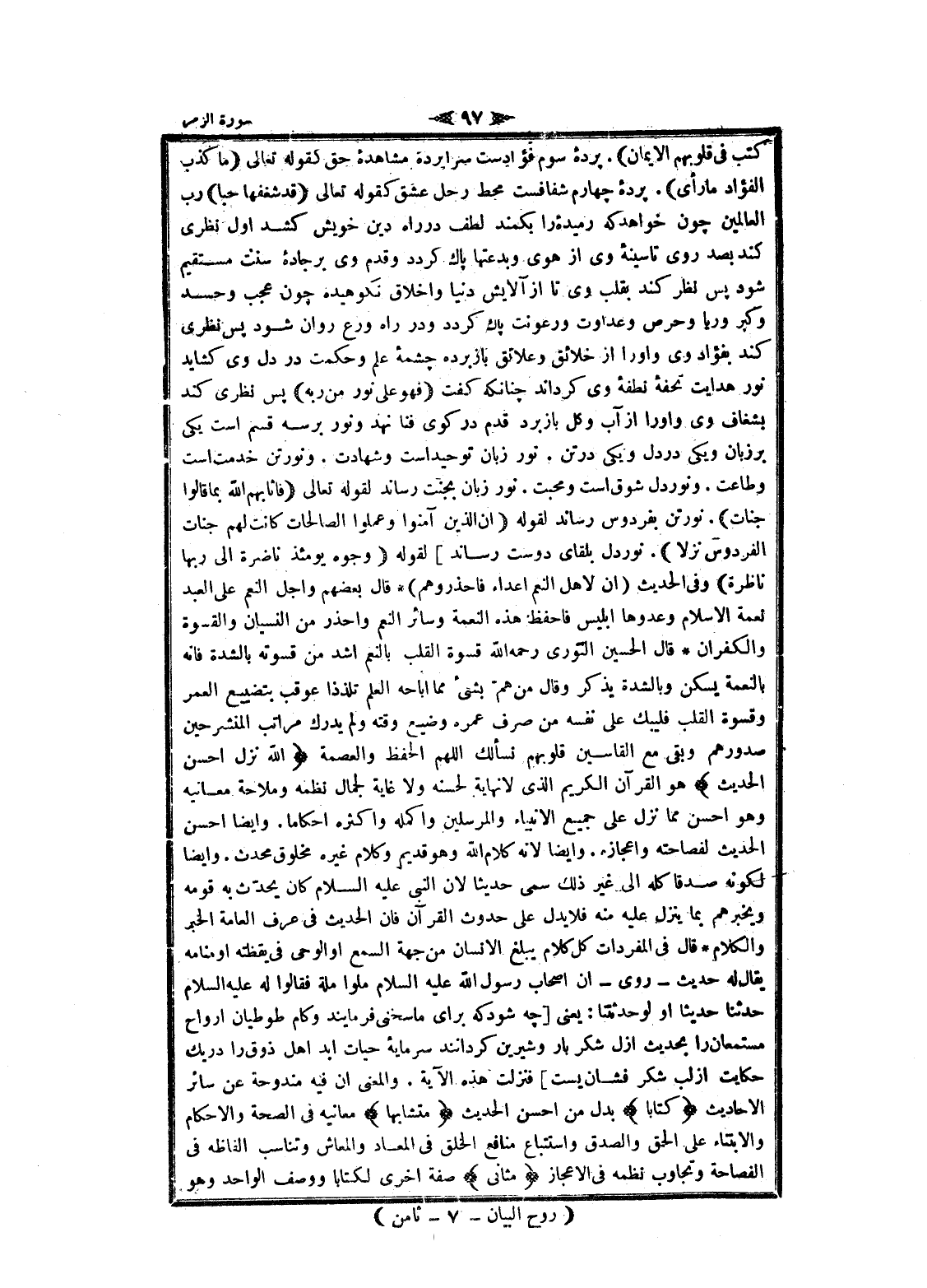 پرده سوم فؤادست سراپرده مشاهده حق كقوله تعالى (ما كَذَبَ الْفُؤادُ ما رَأى) . پرده چهارم شفافست محبط رحل عشق كقوله تعالى (قَدْ شَغَفَها حُبًّا) رب العالمين چون خواهد كه رميده را بكمند لطف در راه دين خويش كشد أول نظرى كند بصد روى تا سينه وى از هوى وبدعتها پاك كردد وقدم وى بر جاده سنت مستقيم شود پس نظر كند بقلب وى تا از آلايش دنيا واخلاق نكوهيده چون عجب وحسد وكبر وريا وحرص وعداوت ورعونت پاك كردد ودر راه ورع روان شود پس نظرى كند بفؤاد وى واو را از خلائق وعلائق باز برده چشمه علم وحكمت در دل وى كشايد نور هدايت تحفه نطفه وى كرداند چنانكه كفت (فَهُوَ عَلى نُورٍ مِنْ رَبِّهِ) پس نظرى كند بشغاف وى واو را از آب وكل باز برد قدم در كوى فنا نهد ونور بر سه قسم است يكى بر زبان ويكى در دل ويكى در تن. نور زبان توحيد است وشهادت. ونور تن خدمت است وطاعت. ونور دل شوق است ومحبت. نور زبان بجنت رساند لقوله تعالى (فَأَثابَهُمُ اللَّهُ بِما قالُوا جَنَّاتٍ) . نور تن بفردوس رساند لقوله (إِنَّ الَّذِينَ آمَنُوا وَعَمِلُوا الصَّالِحاتِ كانَتْ لَهُمْ جَنَّاتُ الْفِرْدَوْسِ نُزُلًا) . نور دل بلقاى دوست رساند] لقوله (وُجُوهٌ يَوْمَئِذٍ ناضِرَةٌ إِلى رَبِّها ناظِرَةٌ) وفى الحديث (ان لاهل النعم اعداء فاحذروهم) قال بعضهم وأجل النعم على العبد نعمة الإسلام وعدوها إبليس فاحفظ هذه النعمة وسائر النعم واحذر من النسيان والقسوة والكفران قال الحسين النوري رحمه الله قسوة القلب بالنعم أشد من قسوته بالشدة فانه بالنعمة يسكن وبالشدة يذكر وقال من همّ بشىء مما اباحه العلم تلذذا عوقب بتضييع العمر وقسوة القلب فليبك على نفسه من صرف عمره وضيع وقته ولم يدرك مراتب المنشرحين صدورهم وبقي مع القاسين قلوبهم نسألك اللهم الحفظ والعصمة اللَّهُ نَزَّلَ أَحْسَنَ الْحَدِيثِ هو القرآن الكريم الذي لا نهاية لحسنه ولا غاية لجمال نظمه وملاحة معانيه وهو احسن مما نزل على جميع الأنبياء والمرسلين وأكمله وأكثره احكاما. وايضا احسن الحديث لفصاحته واعجازه. وايضا لانه كلام الله وهو قديم وكلام غيره مخلوق محدث. وايضا لكونه صدقا كله الى غير ذلك سمى حديثا لان النبي عليه السلام كان يحدّث به قومه ويخبرهم بما ينزل عليه منه فلا يدل على حدوث القرآن فان الحديث فى عرف العامة الخبر والكلام قال فى المفردات كل كلام يبلغ الإنسان من جهة السمع او الوحى فى يقظته او منامه يقال له حديث- روى- ان اصحاب رسول الله عليه السلام ملوا ملة فقالوا له عليه السلام حدثنا حديثا او لو حدثتنا: يعنى [چهـ شود كه براى ما سخنى فرمايند وكام طوطيان أرواح مستمعان را بحديث ازل شكر بار وشيرين كردانند سرمايه حيات ابد اهل ذوق را در يك حكايت از لب شكر فشان يست] فنزلت هذه الآية. والمعنى ان فيه مندوحة عن سائر الأحاديث كِتاباً بدل من احسن الحديث مُتَشابِهاً معانيه فى الصحة والاحكام والابتناء على الحق والصدق واستتباع منافع الخلق فى المعاد والمعاش وتناسب ألفاظه فى الفصاحة وتجاوب نظمه فى الاعجاز مَثانِيَ صفة اخرى لكتابا ووصف الواحد وهو