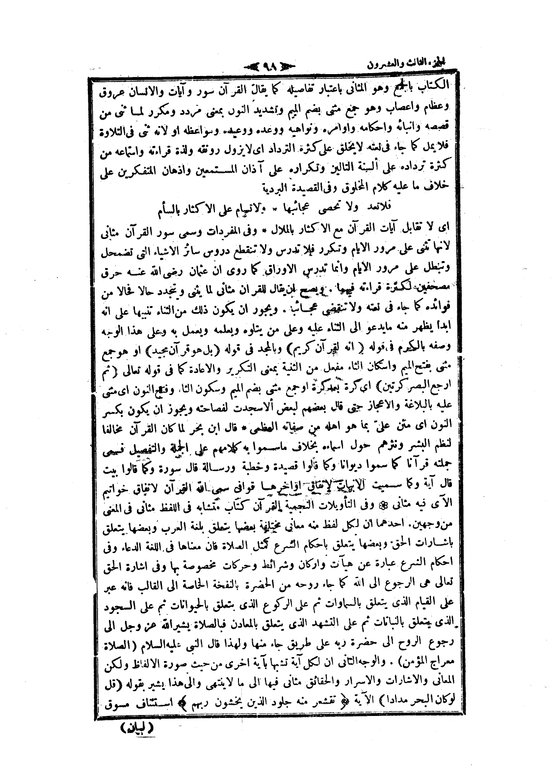 الكتاب بالجمع وهو المثاني باعتبار تفاصيله كما يقال القرآن سور وآيات والإنسان عروق وعظام واعصاب وهو جمع مثنى بضم الميم وتشديد النون بمعنى مردد ومكرر لما ثنى من قصصه وانبائه وأحكامه وأوامره ونواهيه ووعده ووعيده ومواعظه او لانه ثنى فى التلاوة فلا يمل كما جاء فى نعته لا يخلق على كثرة الترداد اى لا يزول رونقه ولذة قراءته واستماعه من كثرة ترداده على ألسنة التالين وتكراره على آذان المستمعين وأذهان المتفكرين على خلاف ما عليه كلام المخلوق وفى القصيدة البردية