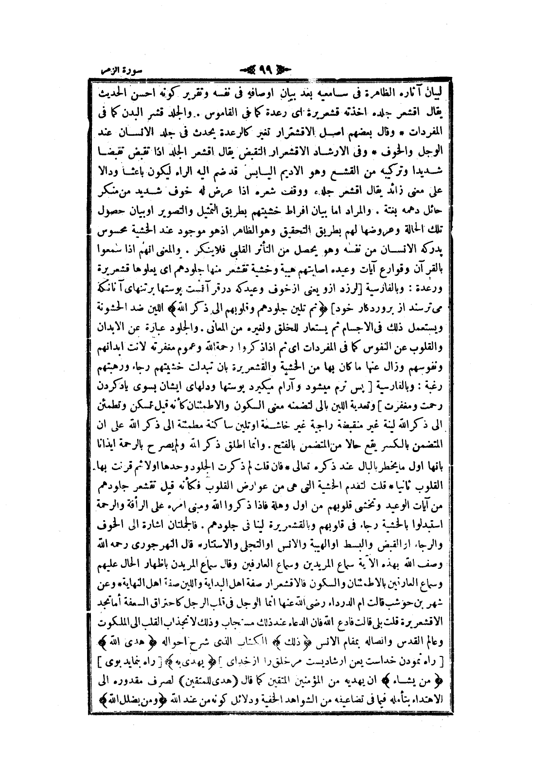 لبيان آثاره الظاهرة فى سامعيه بعد بيان أوصافه فى نفسه وتقرير كونه احسن الحديث يقال اقشعر جلده أخذته قشعريرة اى رعدة كما فى القاموس. والجلد قشر البدن كما فى المفردات وقال بعضهم اصل الاقشعرار تغير كالرعدة يحدث فى جلد الإنسان عند الوجل والخوف وفى الإرشاد الاقشعرار التقبض يقال اقشعر الجلد إذا تقبض تقبضا شديدا وتركيبه من القشع وهو الأديم اليابس قد ضم اليه الراء ليكون باعثا ودالا على معنى زائد يقال اقشعر جلده ووقف شعره إذا عرض له خوف شديد من منكر حائل دهمه بغتة. والمراد اما بيان افراط خشيتهم بطريق التمثيل والتصوير او بيان حصول تلك الحالة وعروضها لهم بطريق التحقيق وهو الظاهر إذ هو موجود عند الخشية محسوس يدركه الإنسان من نفسه وهو يحصل من التأثر القلبي فلا ينكر. والمعنى انهم إذا سمعوا بالقرآن وقوارع آيات وعيده أصابتهم هيبة وخشية تقشعر منها جلودهم اى يعلوها قشعريرة ورعدة: وبالفارسية [لرزد ازو يعنى از خوف وعيد كه در قرآنست پوستها بر تنهاى آنانكه مى ترسند از پروردگار خود] ثُمَّ تَلِينُ جُلُودُهُمْ وَقُلُوبُهُمْ إِلى ذِكْرِ اللَّهِ اللين ضد الخشونة ويستعمل ذلك فى الأجسام ثم يستعار للخلق ولغيره من المعاني. والجلود عبارة عن الأبدان والقلوب عن النفوس كما فى المفردات اى ثم إذا ذكروا رحمة الله وعموم مغفرته لانت أبدانهم ونفوسهم وزال عنها ما كان بها من الخشية والقشعريرة بان تبدلت خشيتهم رجاء ورهبتهم رغبة: وبالفارسية [پس نرم ميشود وآرام ميكيرد پوستها ودلهاى ايشان بسوى ياد كردن رحمت ومغفرت] وتعدية اللين بالى لتضمنه معنى السكون والاطمئنان كأنه قيل تسكن وتطمئن الى ذكر الله لينة غير منقبضة راجية غير خاشعة او تلين ساكنة مطمئنة الى ذكر الله على ان المتضمن بالكسر يقع حالا من المتضمن بالفتح. وانما اطلق ذكر الله ولم يصرح بالرحمة إيذانا بانها أول ما يخطر بالبال عند ذكره تعالى فان قلت لم ذكرت الجلود وحدها اولا ثم قرنت بها القلوب ثانيا قلت لتقدم الخشية التي هى من عوارض