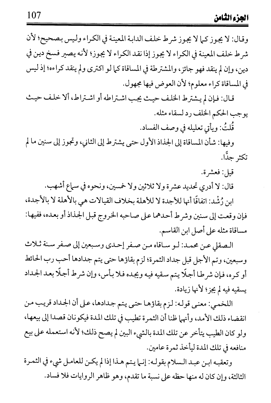 وفيها: شأن المساقاة إلى الجذاذ الأول حتى يشترط إلى الثانى، وتجوز إلى سنين ما لم تكثر جدا.