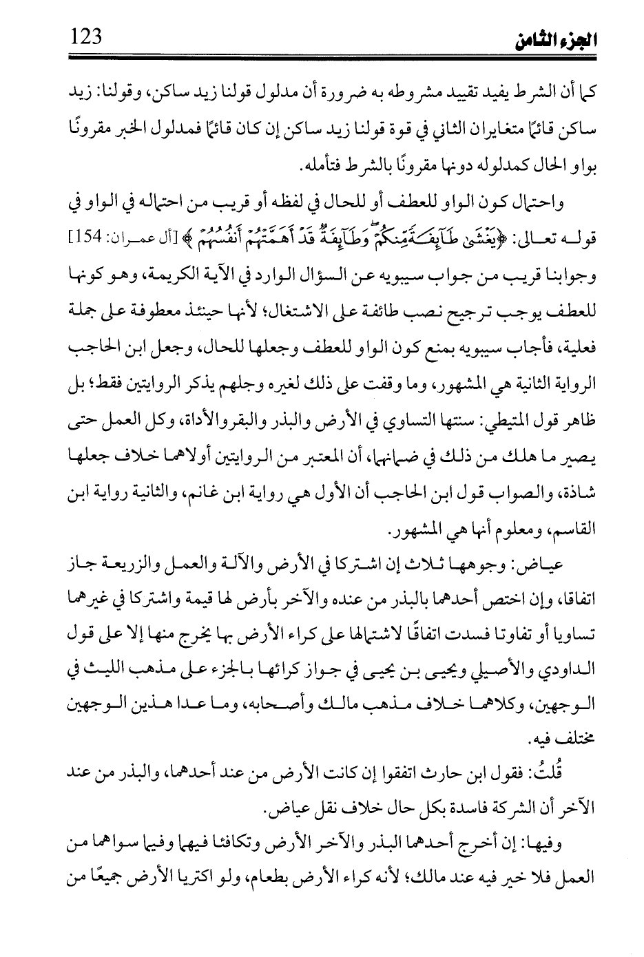 واحتمال كون الواو للعطف أو للحال في لفظه أو قريب من احتماله في الواو في قوله تعالى: {يَغْشَى طَائِفَةً مِنْكُمْ وَطَائِفَةٌ قَدْ أَهَمَّتْهُمْ أَنْفُسُهُمْ} [آل عمران:154] وجوابنا قريب من جواب سيبويه عن السؤال الوارد في الآية الكريمة، وهو كونها للعطف يوجب ترجيح نصب طائفة على الاشتغال؛ لأنها حينئذ معطوفة على جملة فعلية، فأجاب سيبويه بمنع كون الواو للعطف وجعلها للحال، وجعل ابن الحاجب الرواية الثانية هي المشهور، وما وقفت على ذلك لغيره وجلهم يذكر الروايتين فقط؛ بل ظاهر قول المتيطي: سنتها التساوي في الأرض والبذر والبقر والأداة، وكل العمل حتى يصير ما هلك من ذلك في ضمانهما، أن المعتبر من الروايتين أولاهما خلاف جعلها شاذة، والصواب قول ابن الحاجب أن الأول هي رواية ابن غانم، والثانية رواية ابن القاسم، ومعلوم أنها هي المشهور.