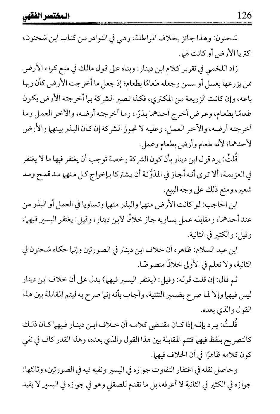 قُلتُ: يريد قول ابن دينار بأن كون الشركة رخصة توجب أن يغتفر فيها ما لا يغتفر في العزيمة، ألا ترى أنه أجاز في المدَوَّنة أن يشتركا بإخراج كل منهما مد قمح ومد شعير، ومنع ذلك عل وجه البيع.