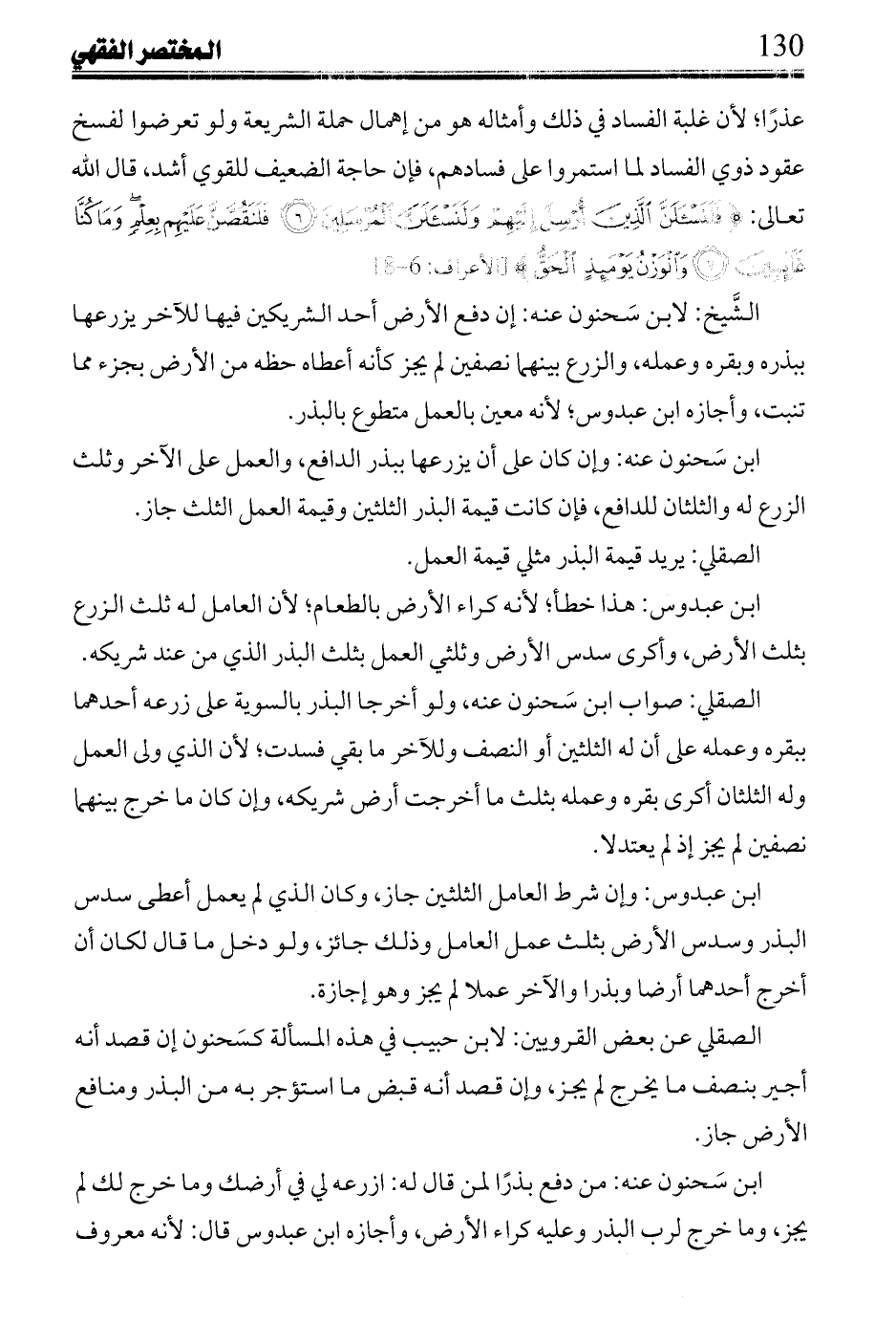 ابن سحنون عنه: وغن كان على أن يزرعها ببذر الدافع، والعمل على الآخر وثلث الزرع له والثلثان للدافع، فإن كانت قيمة البذر الثلثين وقيمة العمل الثلث جاز.