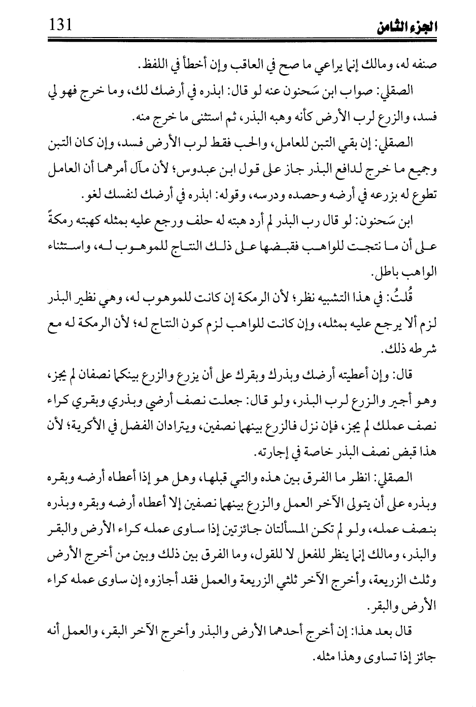 الصقلي: انظر ما الفرق بين هذه والتي قبلها، وهل هو إذا أعطاه أرضه وبقره وبذره على أن يتولى الآخر العمل والزرع بينهما نصفين إلا أعطاه أرضه وبقره وبذره بنصف عمله، ولو لم تكن المسألتان جائزتين إذا ساوى عمله كراء الأرض والبقر والبذر، ومالك إنما ينظر للفعل لا للقول، وما الفرق بين ذلك وبين من أخرج الأرض وثلث الزريعة، وأخرج الآخر ثلثي الزريعة والعمل فقد أجازوه إن ساوى عمله كراء الأرض والبقر.