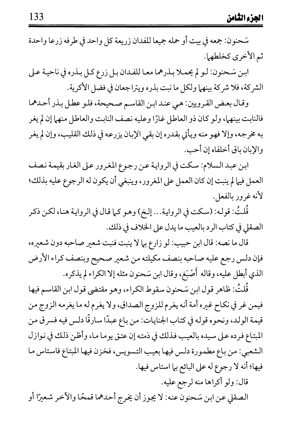 ابن عبد السلام: سكت في الرواية عن رجوع المغرور على الغار بقيمة نصف العمل فيما لم ينبت إن كان العمل على المغرور، وينبغي أن يكون له الرجوع عليه بذلك؛ لأنه غرور بالفعل.