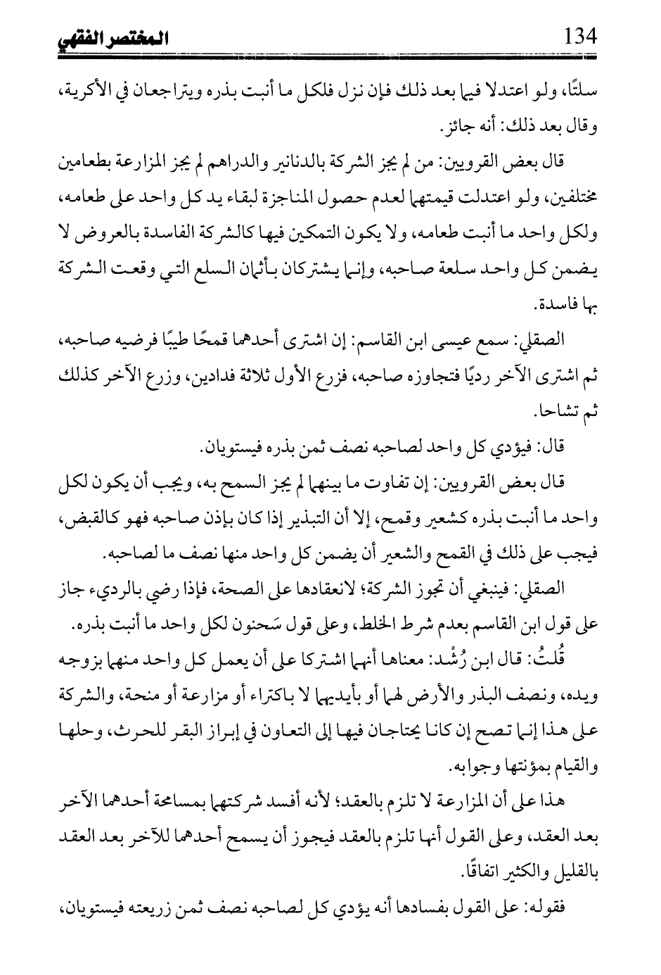 قال بعض القرويين: من لم يجز الشركة بالدنانير والدراهم لم يجز المزارعة بطعامين مختلفين، ولو اعتدلت فيمتهما لعدم حصول المناجزة لبقاء يد كل واحد على طعامه، ولكل واحد ما أنبت طعامه، ولا يكون التمكين فيها كالشركة الفاسدة بالعروض لا يضمن كل واحد سلعة صاحبه، وإنما يشتركان بأثمان السلع التي وقعت الشركة بها فاسدة.