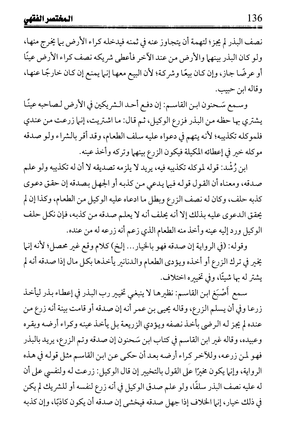 ابن رشد: قوله لموكله تكذيبه فيه، يريد لا يلزمه تصديقه لا أن له تكذيبه ولو علم صدقه، ومعناه أن القول قوله فيما يدعي من كذبه أو الجهل بصدقه إن حقق دعوى كذبه حلف، وكان له نصف الزرع وبطل ما ادعاه عليه الوكيل من الطعام، وكذا إن لم يحقق الدعوى عليه بذلك إلا أنه يحلف أنه لا يعلم صدقه من كذبه، فإن نكل حلف الوكيل ورد عينه وأخذ منه الطعام الذي زعم أنه زرعه له من عنده.
