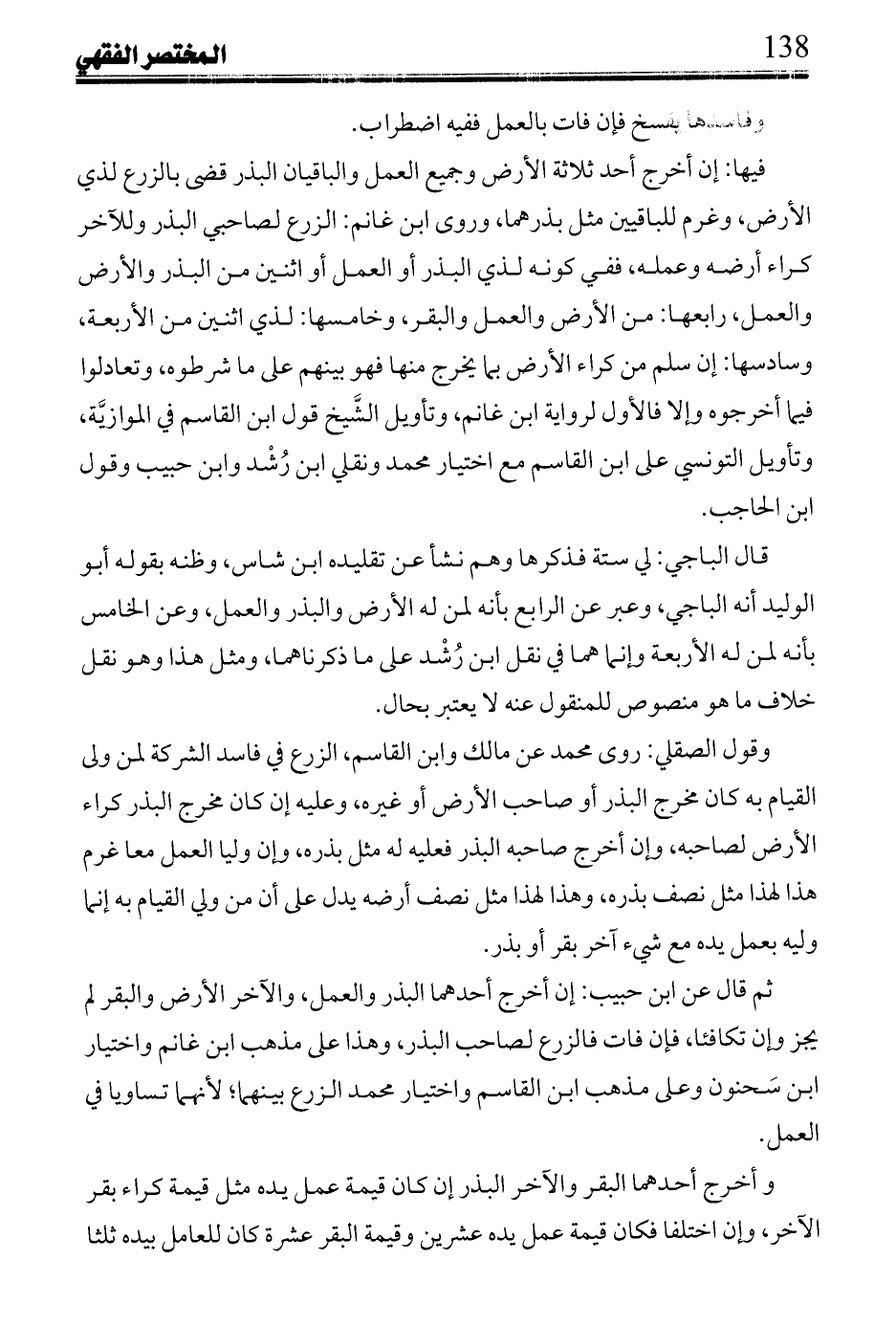 فيها: إن أخرج أحد ثلاثة الأرض وجميع العمل والباقيان لبذر قضى بالزرع لذي الأرض، وغرم للباقيين مثل بذرهما، وروى ابن غانم: الزرع لصاحبي البذر وللآخر كراء أرضه وعمله، ففي كونه لذي البذر أو العمل أو اثنين من البذر والأرض والعمل، رابعها: من الأرض والعمل والبقر، وخامسها: لذي اثنين من الأربعة، وسادسها: إن سلم من كراء الأرض بما يخرج منها فهو بينهم على ما شرطوه، وتعادلوا فيما أخرجوه وإلا فالأول لرواية ابن غانم، وتأويل الشيخ قول ابن القاسم في الموازية، وتأويل التونسي على ابن القاسم مع اختيار محمد ونقلي ابن رشد وابن حبيب وقول ابن الحاجب.