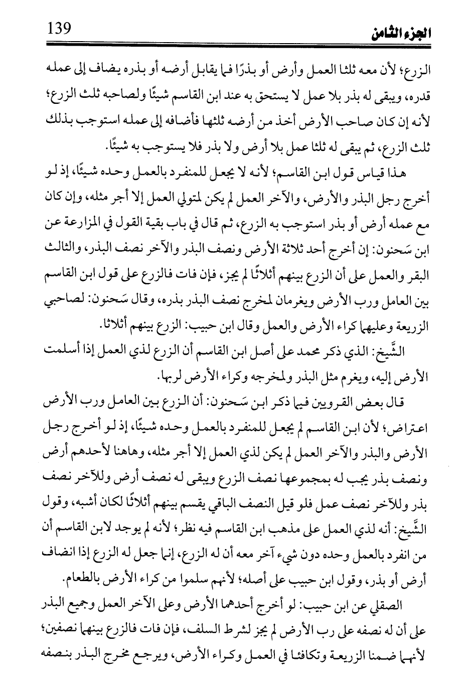 الشيخ: الذي ذكر محمد على أصل ابن القاسم أن الزرع لذي العمل إذا أسلمت الأرض إليه، ويغرم مثل البذر ولمخرجه وكراء الأرض لربها.