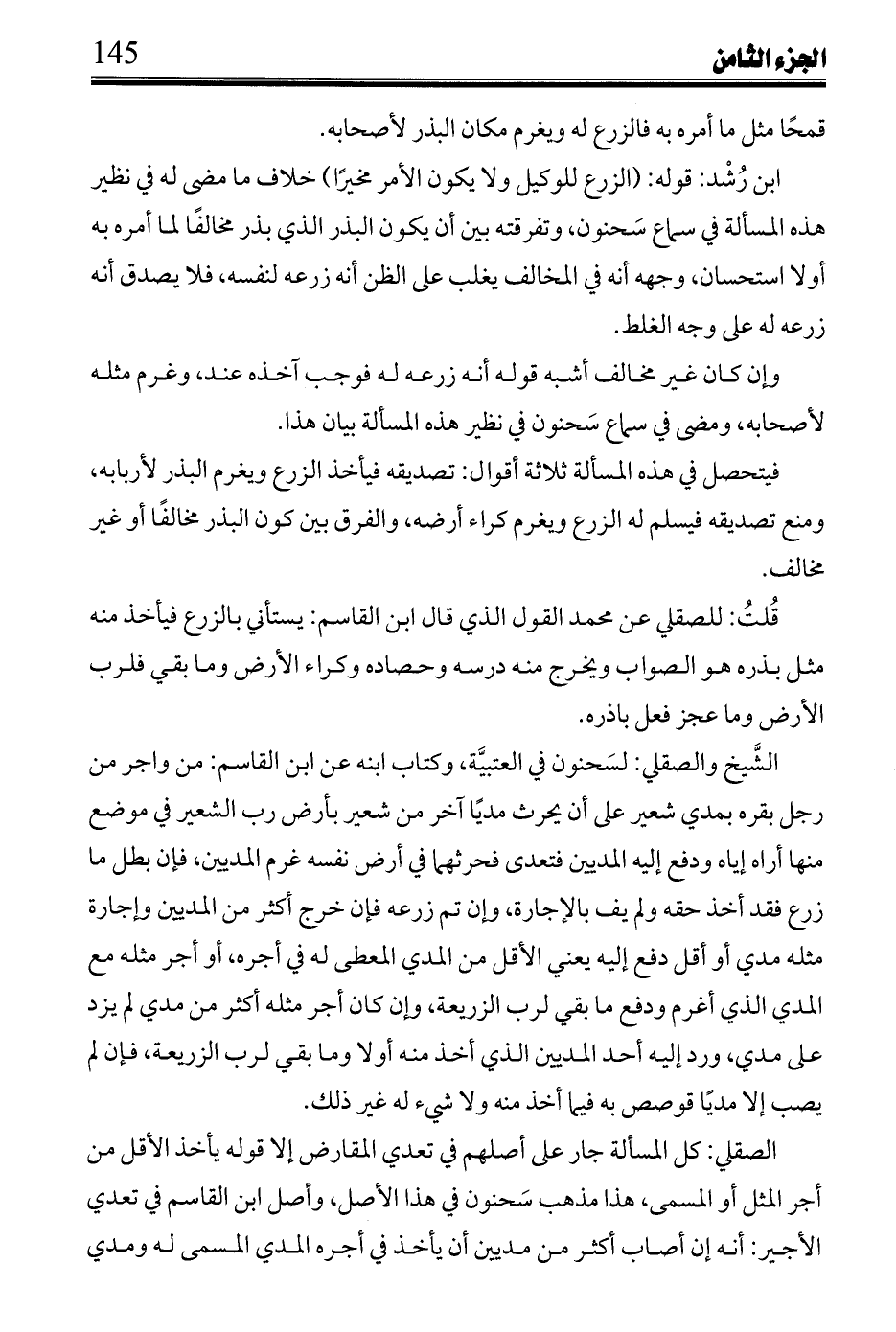 ابن رشد: قوله: (الزرع للوكيل ولا يكون الأمر مخيراً) خلاف ما مضى له في نظير هذه المسألة في سماع سحنون، وتفرقته بين أن يكون البذر الذي بذر مخالفا لما أمره به أولا استحسان، وجهه أنه في المخالف يغلب على الظن أنه زرعه لنفسه، فلا يصدق أنه زرعه له على وجه الغلط.