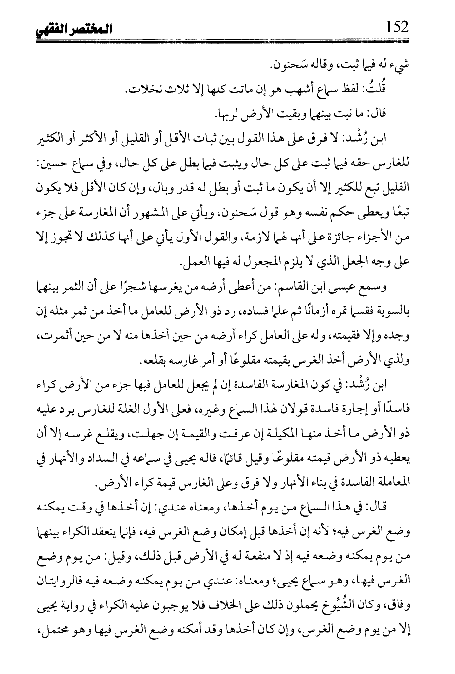 ابن رشد: لا فرق على هذا القول بين ثبات الأقل أو القليل أو الأكثر أو الكثير للغارس حقه فيما ثبت على كل حال ويثبت فيما بطل على كل حال، وفي سماع حسين: القليل تبع للكثير إلا أن يكون ما ثبت أو بطل له قدر وبال، وإن كان الأقل فلا يكون تبعا ويعطى حكم نفسه وهو قول سحنون، ويأتي على المشهور أن المغارسة على جزء من الأجزاء جائزة على أنها لهما لازمة، والقول الأول يأتي على أنها كذلك لا تجوز إلا على وجه الجعل الذي لا يلزم المجعول له فيها العمل.