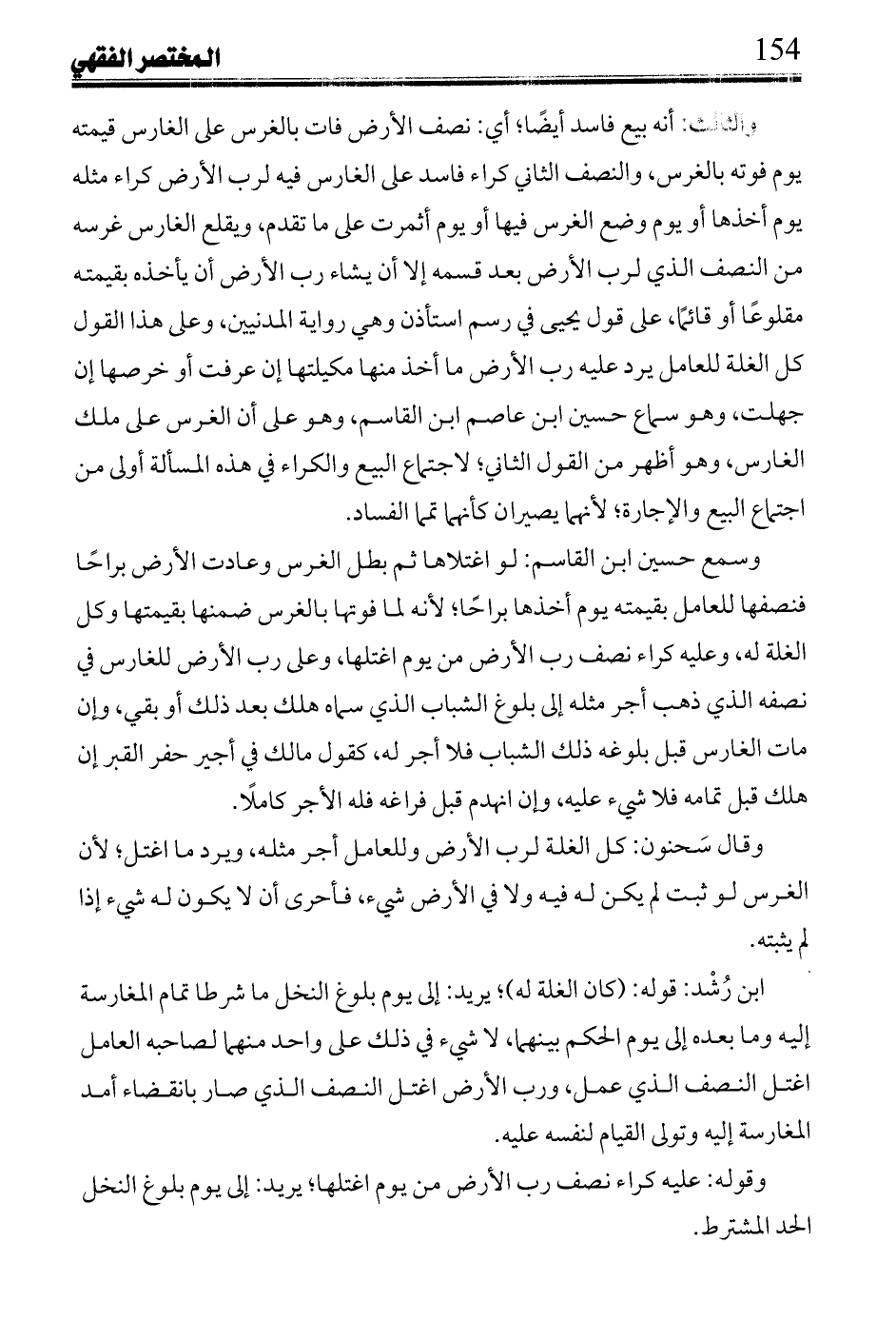 ابن رشد: قوله: (كان الغلة له)؛ يريد: إلى يوم بلوغ النخل ما شرطا تمام المغارسة إليه وما بعده إلى يوم الحكم بينهما، لا شيء في ذلك على واحد منهما لصاحبه العامل اغتل النصف الذي عمل، ورب الأرض اغتل النصف الذي صار بانقضاء أمد المغارسة إليه وتولى القيام لنفسه عليه.