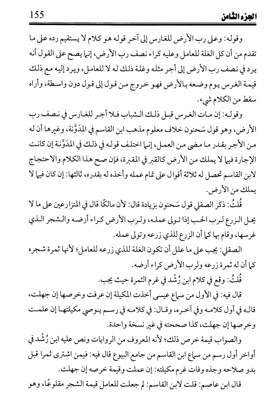 قلت: ذكر الصقلي قول سحنون بزيادة قال: لأن مالكا قال في المتزارعين على ما لا يحل الزرع لرب الحب إذا تولى عمله، ولرب الأرض كراء أرضه والشجر الذي غرسها، وقام بها كما أن الزرع للذي زرعه وتولى عمله.