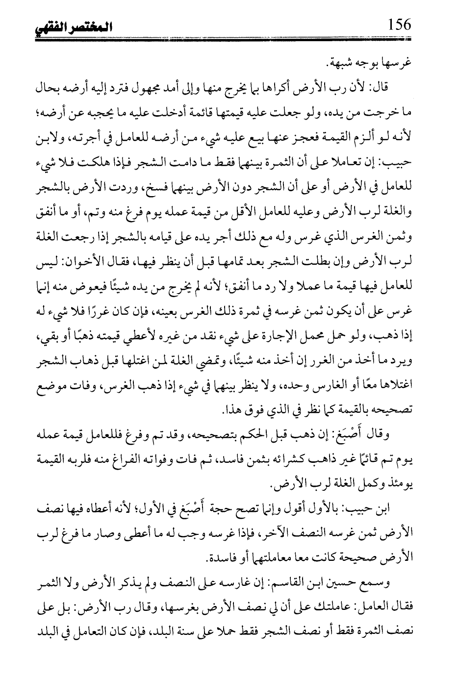 ابن حبيب: بالأول أقول وإنما تصح حجة أصبغ في الأول؛ لأنه أعطاه فيها نصف الأرض ثمن غرسه النصف الآخر، فإذا غرسه وجب له ما أعطى وصار ما فرغ لرب الأرض صحيحة كانت معا معاملتهما أو فاسدة.
