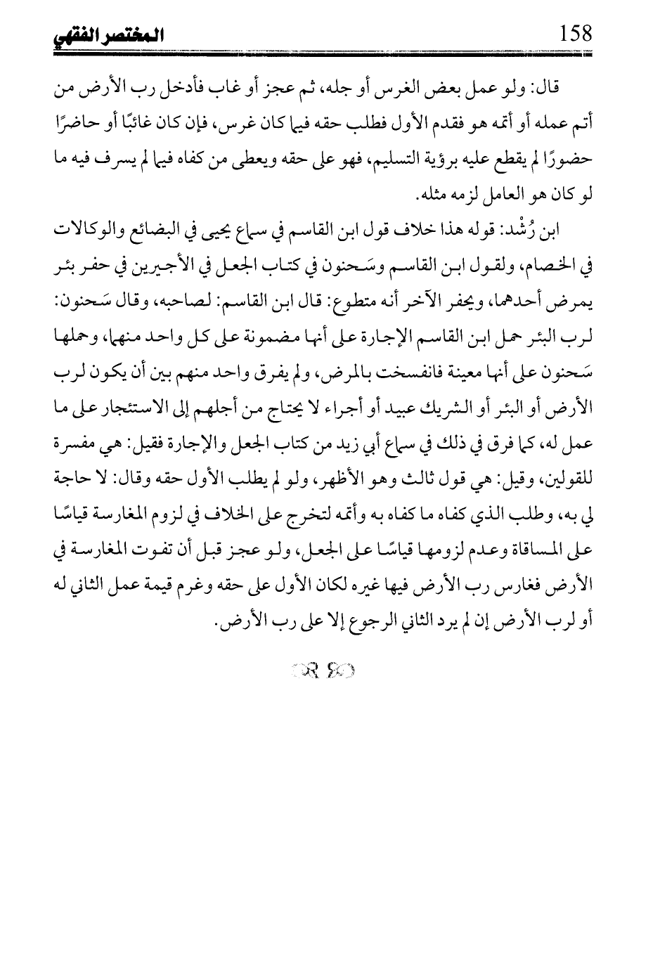 ابن رشد: قوله هذا خلاف قول ابن القاسم في سماع يحيى في البضائع والوكالات في الخصام، ولقول ابن القاسم وسحنون في كتاب الجعل في الأجيرين في حفر بئر يمرض أحدهما، ويحفر الآخر أنه متطوع: قال ابن القاسم: لصاحبه، وقال سحنون: لرب البئر حمل ابن القاسم الإجارة على أنها مضمونة على كل واحد منهما، وحملها سحنون على أنها معينة فانفسخت بالمرض، ولم يفرق واحد منهم بين أن يكون لرب الأرض أو البئر أو الشريك عبيد أو أجراء لا يحتاج من أجلهم إلى الاستئجار على ما عمل له، كما فرق في ذلك في سماع أبي زيد من كتاب الجعل والإجارة فقيل: هي مفسرة للقولين، وقيل: هي قول ثالث وهو الأظهر، ولو لم يطلب الأول حقه وقال: لا حاجة لي به، وطلب الذي كفاه ما كفاه به وأتمه لتخرج على الخلاف في لزوم المغارسة قياسا على المساقاة وعدم لزومها قياسا على الجعل، ولو عجز قبل أن تفوت المغارسة في الأرض فغارس رب الأرض فيها غيره لكان الأول على حقه وغرم قيمة عمل الثاني له أو لرب الأرض إن لم يرد الثاني الرجوع إلا على رب الأرض.