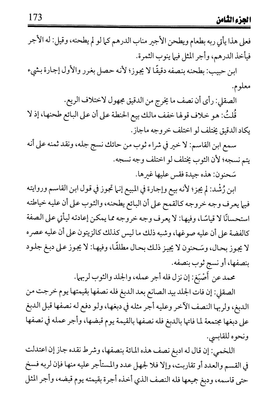 وسمع عيسي ابن القاسم: لا خير في قوله: جد نخلي اليوم ولك نصف ماتجد ومتي شئت فاخرج؛ لأنه وقع علي يوم بعينه فلا يحل إلا بشيء ثابت كقوله: تقاض ما لي علي فلان إلي شهر ولك نصفه فلا خير فيه، وإن لم يضرب أجلًا فهو جعل فجاز؛ لأنه ليس لربه منعه العمل وللعامل الترك متي شاء.