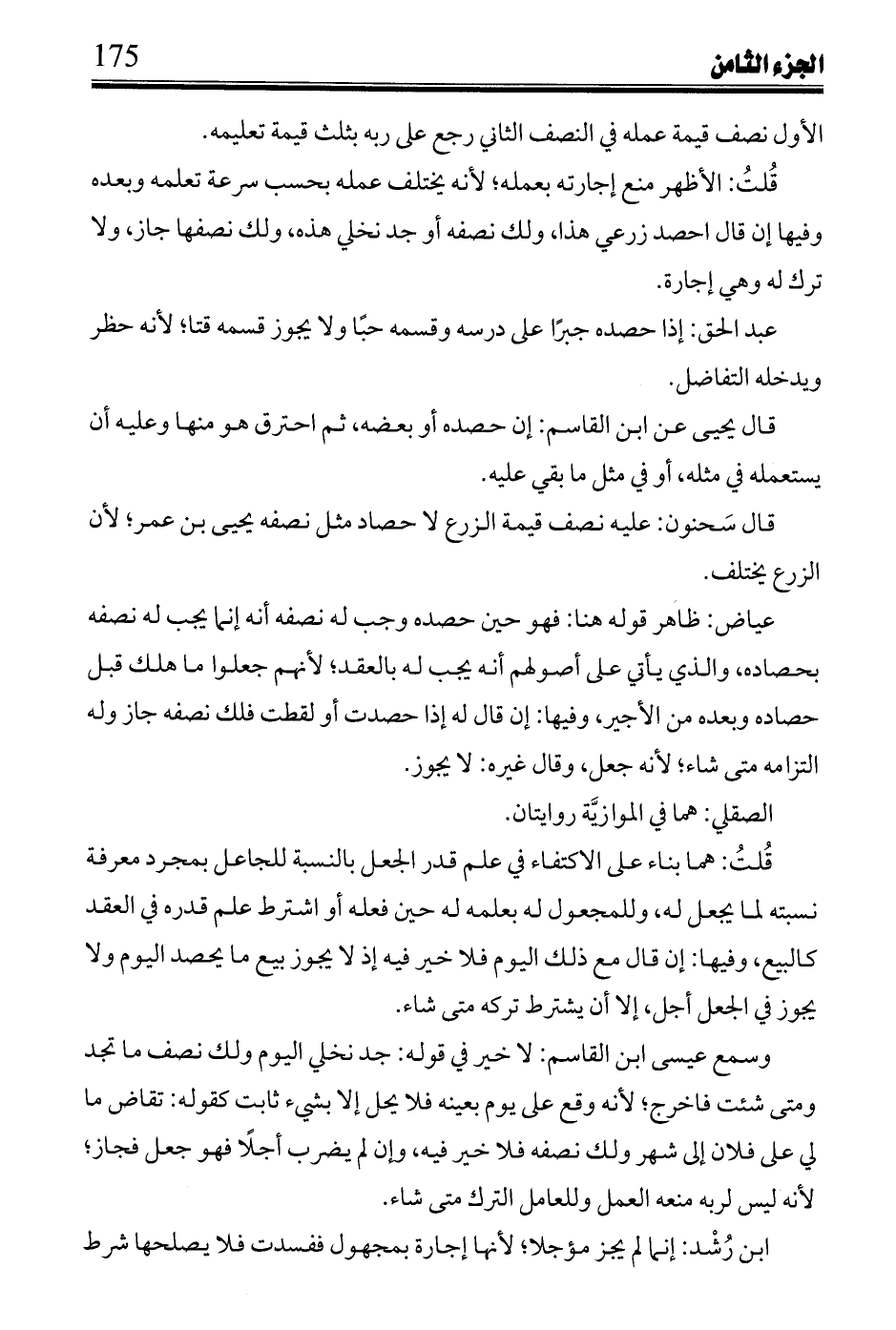 وقال ابن القطان: يريد سَحنون أنه قال: مثل قوله في الثوب في مثل مسألة الثوب وهو أن يجيز الجعل، ويضرب له يومًا أو يومين ويشترط أنه متي شاء أن يرد، وقال سَحنون: له مثل هذا القول وهو جل الذي يعتمد عليه؛ يريد: قول الكتاب ومايشبهه ولفظ جل يقتضي الخلاف، والخلاف موجود في سماع عيسي فذكر سماع عيسي المتقدم وتأويل ابن لبابة أنه أراد أن ابن القاسم، إنما اختلف قوله علي أنها إجارة مرة رآها إجارة جائزة ومرة رآها إجارة فاسدة وكله مدخول.