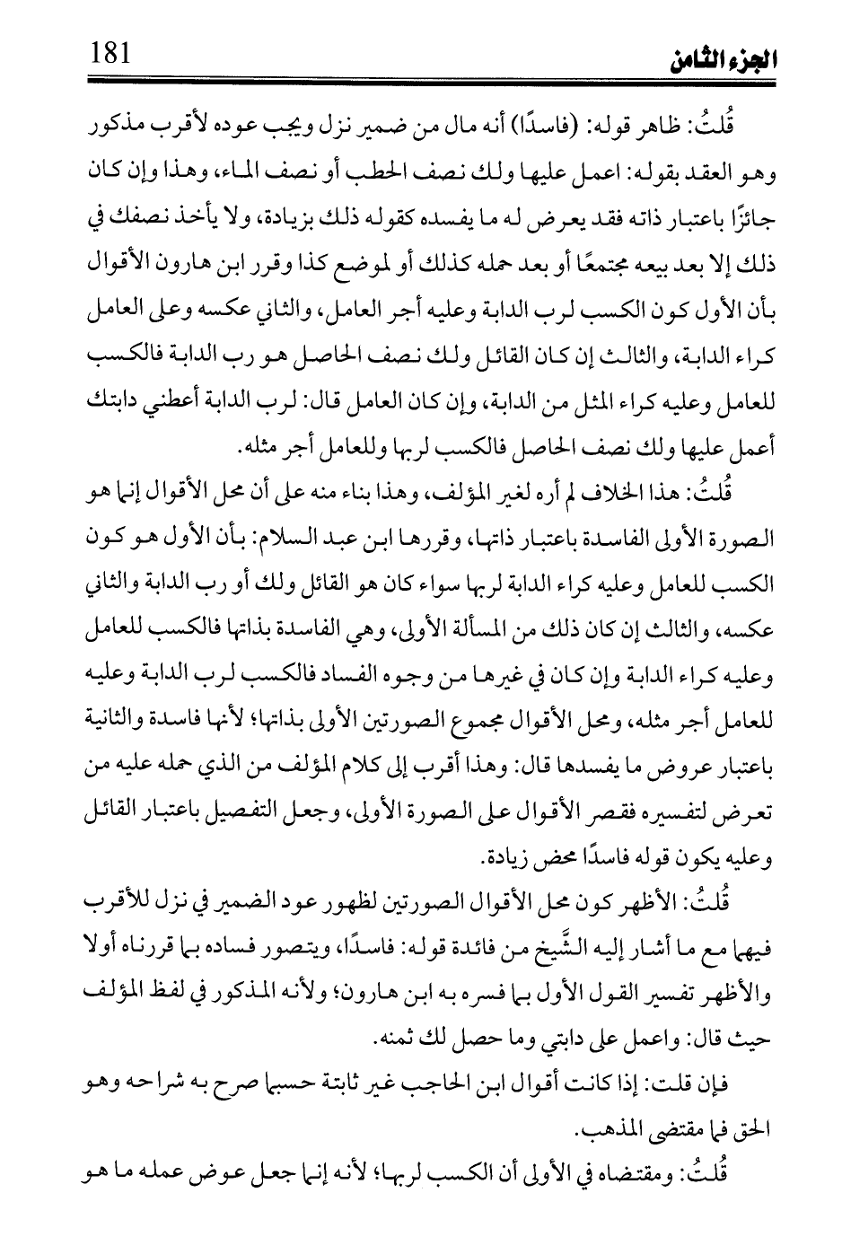 عياض: ضرب على ذكر الاشتراط في كتاب ابن وضاح عند ابن عتاب حيث وقع ولم يقرأه سَحنون، وقال: لا بأس في الغنم والدنانير دون شرطه والحكم يوجبه وقاله: ابن الماجِشُون وأَصْبَغ والصقلي وهو أصوب؛ لأن المستأجر عليه لا يتعين والحكم يوجب خلفه، وكذا في المدَوَّنة والموازيَّة وقال بعض أصحابنا: وإنما يتم هذا البيع إن أحضر المشتري الثمن لينتقل من ذمته لأمانته، وحكي عن القابسي فإن لم يحضره فسدت الإجارة فقط لتهمته على أن يؤخره ويزيده كقول ابن القاسم فيه: قوله: لمن له عليه دين اعمل به قراضاً وخففه أشهب.