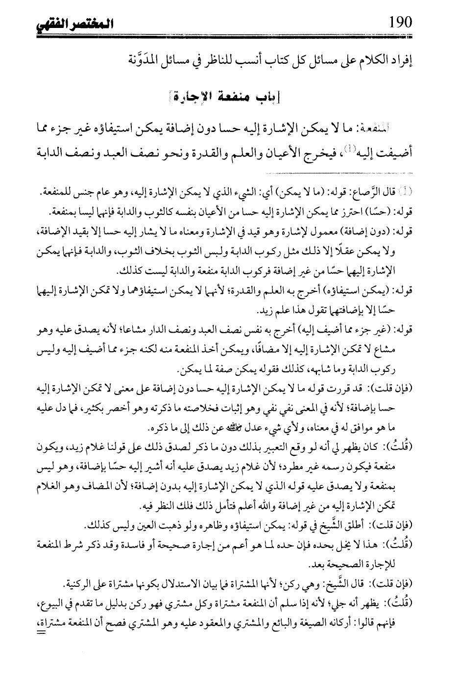 وتبع ابن شاس وابن الحاجب الغزالى فقالا: هى متقومة غير متضمنة باستيفاء عين مقدورا على تسليمها غير حرام، ولا واجبة معلومة ففسروا متقومة بها لها قيمة وهو قول الغزالى عنينا بالمتقوم أن استئجار تفاحة للشم والطعام لتزين الحانوت لا يصح، فإنه لا قيمة له، وتبع ابن الحاجب ابن شاس فى قوله: فى إجارة الأشجار لتجفيف الثياب قولان وقبله شارحاه، ولا أعرف القول بالمنع ومقتضى المذهب الجواز كإجارة مصب مرحاض، وحائط لحمل خشب، وفى الخيار منها لا تجوز إجارة ما لا يعرف بعينه من طعام، أو إدام، أو نحوه.