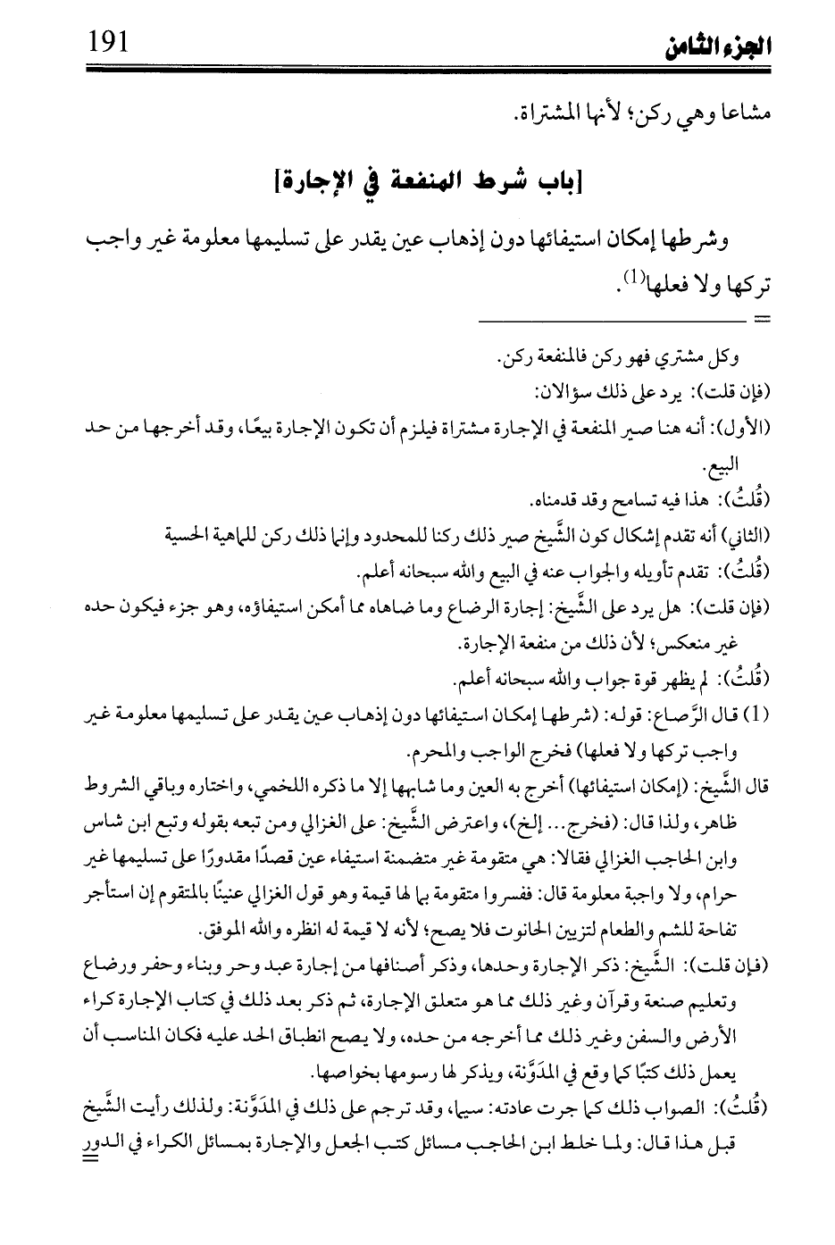الصقلى: عنه بعد نقله عنه لفظ لا يجوز، وكره إجارته من لقيت من أصحاب مالك، واختلف فيه قول ابن القاسم ففى كون الكراهة، ثالثا: نظر ابن شاس الشرط الثانى أن لا يتضمن استيفاء عين فلا يصح استئجار الأشجار لثمرها والشاة لنتاجها ولبنها وصوفها؛ لأنه بيع عين قبل الوجود وتبعه ابن الحاجب، ولا أذكر هذا الفرع لأهل المذهب فى الإجارات لوضوح حكمه من البياعات؛ وإنما ذكره الغزالى وتبعه ولو رسموا المنفعة بما قلناه ما احتاجوا لذكره، واستثنى ابن شاس مسألة إدخال الشجرة فى الدار، وفى اكترائها فى أكرية الدور منها من اكترى دارا أو أرضا بها أو دالية أو بالأرض سندس نخل لا ثمر فيها أو بها ثمر لم يزه فالثمرة للمكرى إلا أن يشترطها المكترى، فإن كانت مثل الثلث فأقل جاز ويلغى الثلث عن مالك ولم يبلغه فى سؤالى إيال تقوم الأرض أو الدار دون الثمرة إن قيل: عشرة، قيل: ما قيمة الثمرة فما عرف مما تطعم كل عام بعد طرح قيمة المؤنة، والعمل إن قيل: خمسة فأقل جاز كالمساقاة.