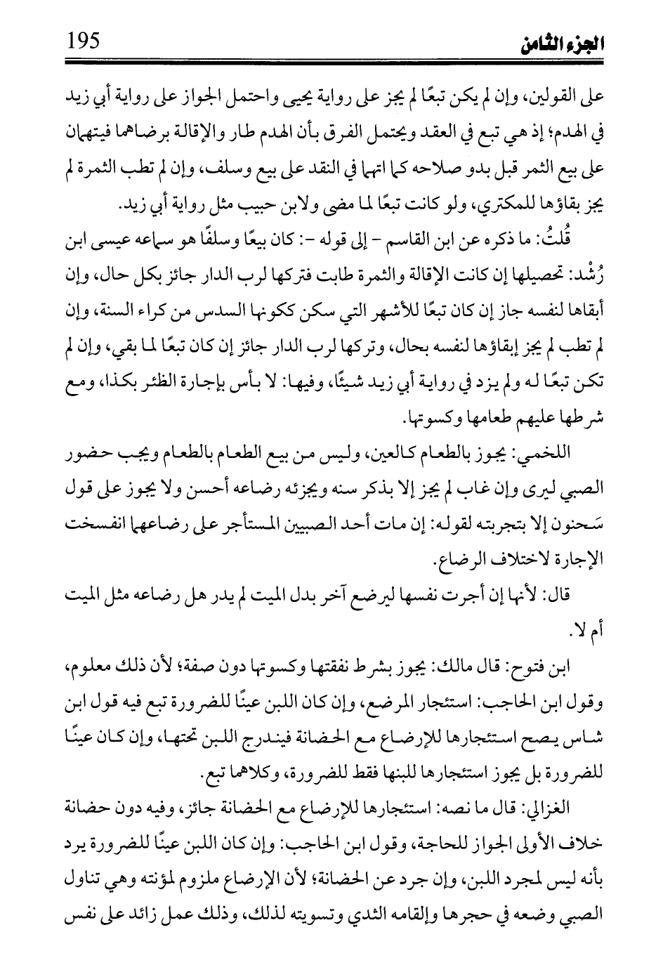 قلت: إلا أن تنزل بها حاجة، وفيها: إن مرضت بحيث لا تقدر على رضاعه فسخت الإجارة، فإن صحت فى بقية منها جبرت على رضاعه بقيتها، ولها من الأجر بقدر ما أرضعت ولا عليها إرضاع ما مرضت.