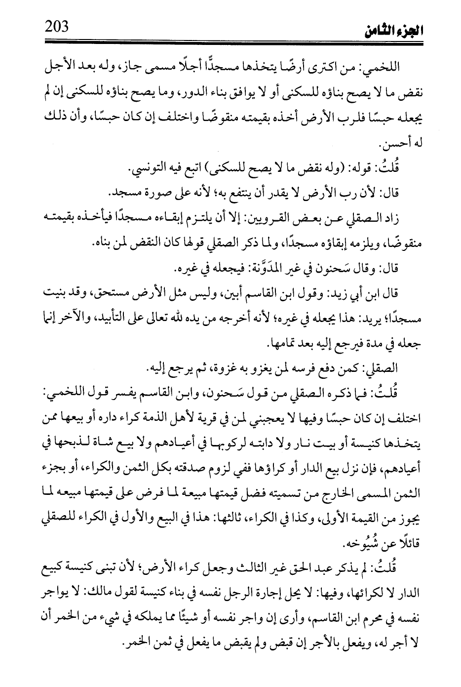 وفيها: لا بأس بالإجارة على تعليم القرآن كل سنة أو كل شهر بكذا أو على الحذاق للقرآن أو على أن يعلمه كله أو سدسه بكذا ونحوه سمع القرينان ابن رشد: إجارة ذلك هو المذهب، وأجمع عليه أهل المدينة وهم الحجة على من سواهم، واحتج ابن رشد بحديث جواز الجعل على الرقية بالقرآن حسبما هو مذكور في الجعل والإجارة عليه جائزة مشاهرة، ومقاطعة على جميعه أو على جزء منه معلوم نظراً أو ظاهراً ووجيبة لمدة معلومة من الشهور، أو الأعوام فالمشاهرة غير لازمة لأحدهما والوجيبة والمقاطعة لازمة لهما، وأجاز ابن حبيب أن يسمي المقاطعة أجلاً ورواه وهو