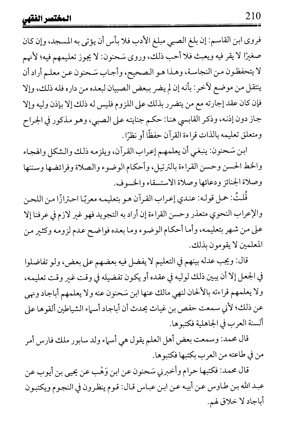 يعرفون حق المعلم في العيدين ورمضان، وقدوم غائب القابسي إنما المعروف العيدان، وأما غيرهما وعاشوراء ففعل الخاصة، وأجاب القابسي عمن علمه معلم بعض القرآن ثم أكمله له غيره بأن: لكل منهما من الحذقة بقدر ما علم أنصافًا أو أثلاثًا، ونحوه وربما استحقها الأول فقط إن بلغ من تعليمه مقاربة الختم بحيث بلغ ما يستغنى به عن المعلم وربما استحقها الثاني فقط إن قل لبثه عند الأول ولم ينل من تعليمه ما له بال، وقال ابن حبيب: إن شورط المعلم على أجر معلوم في كل شهر أو شهرين، وعلى قدر معلوم في الحدقة فلوليه إخراجه، وعليه من الحذقة بقدر ما قرأ منها، ولو لم يقرأ منها إلا الثلث أو الربع فعليه بحسابه لاشتراطه ما سمى مع إخراجه، ولو شارطه على أن يحدقه بكذا أو كذا لم يكن لوليه أن يخرجه حتى يتم حذقته.