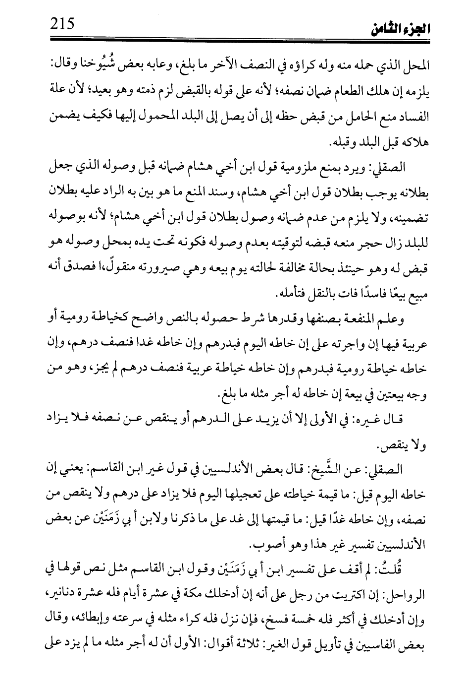 ابن رشد: أجازه في تعجيل الثوب؛ لأنه ممكن ولا ينبغي له مطله؛ لأنه إضرار به لغير سبب، وله أن يتسع في عمله، ويؤخره لعمله غيره أو لبعض حوائجه على عرف تراخي الصناع فزيادته على تفرغه لعمله جائز، وكرهه في تعجيل توصيل الكتاب معناه: إن لم يكن على يقين من إدراك إأيصاله ذلك اليوم إن أسرع، ولو كان على يقين جاز كالثوب، ولو شك في تعجيل الثوب في ذلك اليوم كان كالرسول يبين ذلك قوله في التفسير ليحيى إن كثرت الثياب كره ذلك فيها، ولا فرق بين الثياب الكثيرة والثوب إلا الشك في الثياب الكثيرة هل يفرغ منها في ذلك الوقت، ومعنى إجازة سحنون ذلك في الرسول أنه على يقين من وصوله ذلك اليوم فالأقوال كلها متفقة.