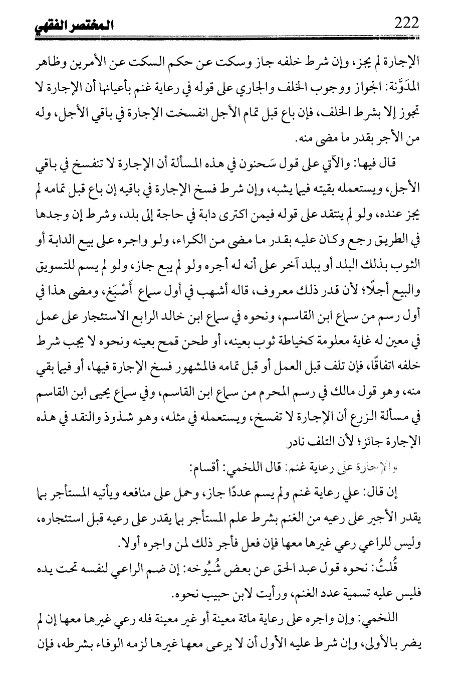 نفسه مجيز لفله، وإن قال أستأجرك على رعي هذه الغنم، فقيل: جائز وقوله هذه كالصفة، ويخلف غيرها إن أصيبت ولا يتعين، وقيل: يتعين والإجارة فاسدة؛ لأن فيه تحجيرًا على ربها لا يقدر على بيعها، وقيل: جائزة ويتعين؛ لأن ربها يشترط ذلك خوف تكلفه الخلف، وقيل: إن قرب أمد الإجارة جاز، وإن بعد لم يجز، وكذا قوله تحمل هذه الأحمال لبلد كذا في كتاب الرواحل منها لا يتعين، وعلى قوله في الغنم: يتعين وتجري فيها الأقوال الثلاثة، وأرى الجواز فيما قرب وفيما بعد إن كان الشرط من رب الغنم، وفيها: إن كان العرف رعاية ولد الغنم معها لزمت وإلا فلا، وفي الرواحل منها إن ولدت المرأة حمل ولدها معها، ففي كونها كالغنم مقيدة بالعرف أو مطلقة ويفرق بأن ولد المرأة كان محمولًا معها أو لا فرق، وهو تناقض أقوال المتأخرين.