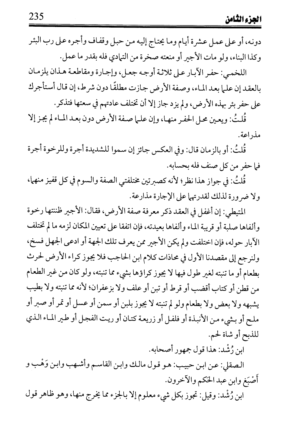 قُلتُ: وكذا الأمر عندنا في أراضي تونس، وفي قولهم ينظر إلى ما يقع له من ذلك الجزء ثلث أو ربع دراهم نظر؛ لأن ظاهره البناء على ما دخلا عليه من الجزء هو عقد فاسد فيجب لغو ما دخلا عليه فيه، وينظر إلى قيمتها بالجزء أن لو جاز فيها، ثم ينظر إلى قيمة ذلك الجزء ففي قصر جواز كرائها على غير مطلق طعام، وما يستنبت فيها لا عن طول أو على غير الجزء مما يخرج منها أو على غير القمح والشعير والسلت، رابعها: هذا بقيد أن يزرع فيها غير ما أكريت به، وخامسها: على ما لو أعيد فيها لم ينبت ولو كان طعاماً، وسادسها: يجوز بالجزء مما يخرج منها المشهور مع أكثر الرواة، وابن رُشْد مع أبي عمر عن ظاهر الموطأ، وله عن ابن نافع، ولابن رُشْد مع الأكثر عنه، ولابن كنانة مع عيسى، والمغيرة ويحيى بن يحيى، وعياض عن الداودي مع الأصيلي ويحيى بن يحيى،