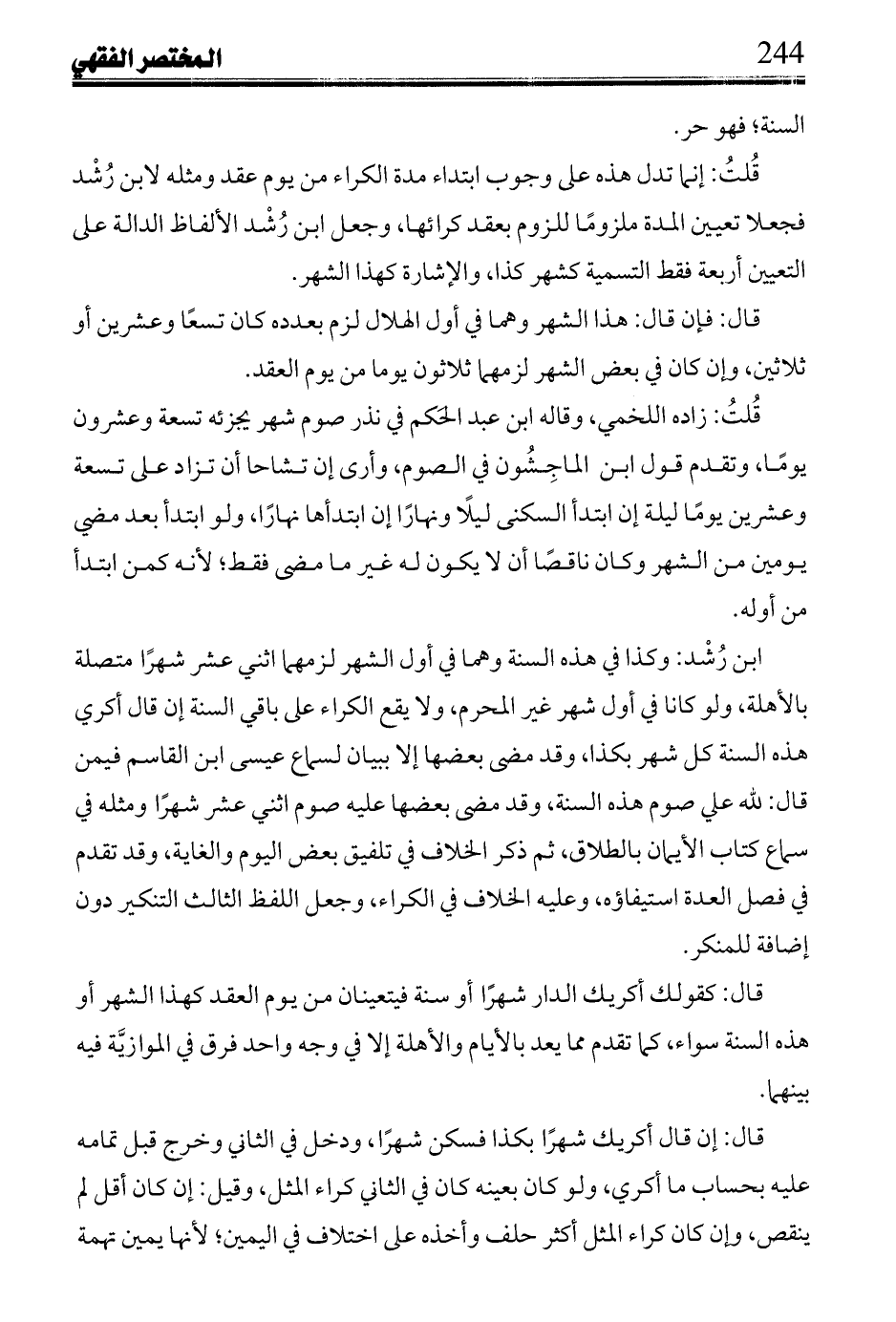 قُلتُ: تقرير رده على المعرب أن قوله أكريك السنة كل شهر بكذا لازم، واللفظ معرف فبطل كونه إذا تعرف تنكر؛ لأنه هنا تعرف وتعين ويرد بمنع لزومه من هذا اللفظ؛ لنص ابن القاسم: بعدم لزومه في لفظ السنة معرفاً، ونص سماعه: بعدم لزومه في كل شهر، والمجموع مما لا يلزم به الكراء لا يلزم به، وقوله: وإنما لزم الكراء في أكريك سنة إلى آخره تقريره أن لزوم السنة فيه ليس من ناحية تنكيره؛ بل للمعنى الذي زعمه فتنكيره لغو، ويرد من وجهين الأول لا يلزم من عدم كون التنكير علة في التعيين عدم مساواته له في الثبوت والنفي، وهذا هو مدعي المعرب لا العلية الثاني ما زعمه موجباً لتعيينه وهو منع عقد الكراء على سنة غير معينة توجب تعيينه، وفي لفظ كراء أو فساد عقده فتأمله.
