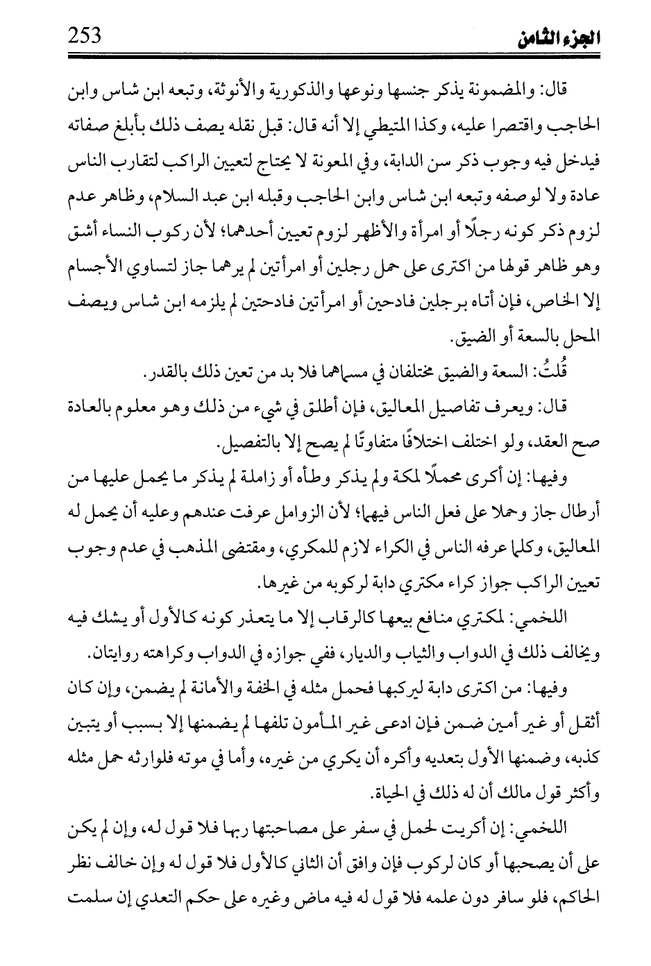 اللخمي: اختلف فيمن اكترى دابة لبلد فأحب الذهاب بها لغيره مما لا يضر بها هل يجوز، وإن كره ربها ثم ذكر قولي ابن القاسم وغيره، قال: ويصح الجبر إن تساويا في البعد والسهولة والأمن، والمكتري يمضي بها وحده ويردها أو كان ربها يمضي معها إلا لحاجة في البلد الأول، وإن اختلف الطريقان أو كان ليترك الدابة بمحل الوصول أو لتعاد وخروج ربها معه لأهل له بذلك البلد أو لتجزئه لم يجبر، وإن اكتراها لركوبها بالحضر ففي جاوز نقلها لحمل عليها أو لسفر، ثالثها: فيما قل كاليومين لأشهب وابن القاسم وسَحنون، وإن اكتراها لطحن الحنطة جاز أن يطحن غير الحنطة مما لا يضر بها، وإن شرط أن لا يطحن إلا الحنطة جاز، لأنه لا يتعذر وجوده ويختلف في طحنه غيرها على شرط ما لا يفيد، وإن شرط أنه لا يطحن إلا هذه الحنطة ففي جوازه قولان.